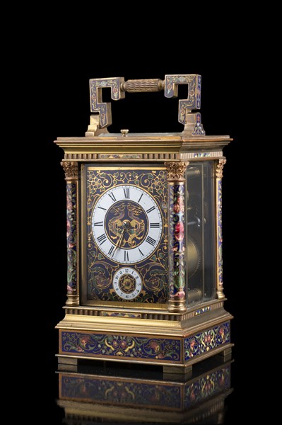 Officier con cassa parallelepipeda in ottone e vetri decorata a smalti cloisonné. Mostra riccamente decorata a smalto con quadrante bianco a fascia con numeri romani. Movimento a due treni con suoneria delle ore e mezze su gong a passaggio e a chiamata. Sveglia su gong. Fine XIX Secolo (h. cm 16) (lievi difetti)