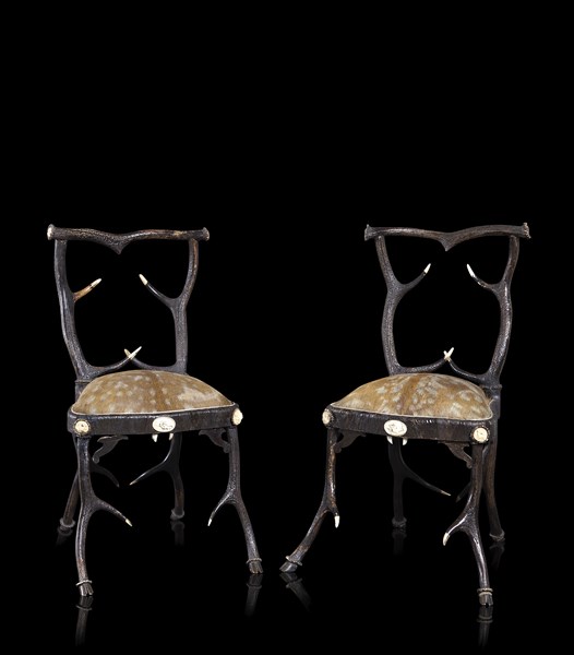 A pair of 19th-century Black Forest horn, ivory and wooden chairs (h. cm 89) (defects and restorations)