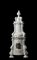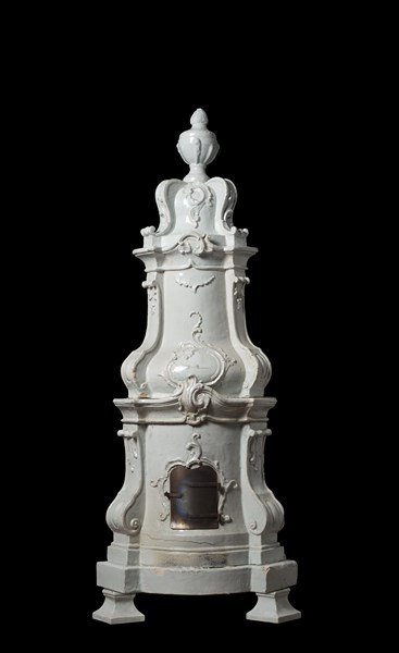 Stufa di forma bombata in maiolica smaltata bianca. Corpo e montanti sagomati decorati a volute fogliate. Pinnacolo a vaso, piedi squadrati (cm 235x90) (difetti e restauri)