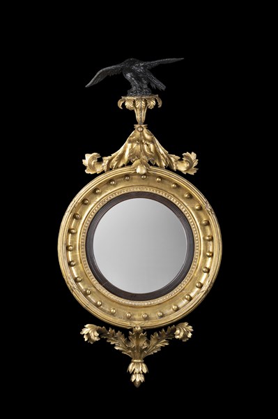 Specchio convesso con cornice in legno dorato decorato nella cimasa a volute fogliate sormontate da aquila a tutto tondo ebanizzata. Cornice interna a bugnature e palmette. Inghilterra, secolo XIX (cm 49,5x99) (difetti e restauri)