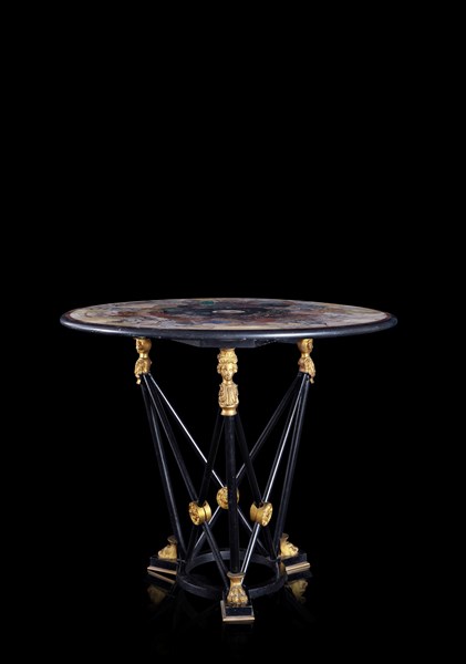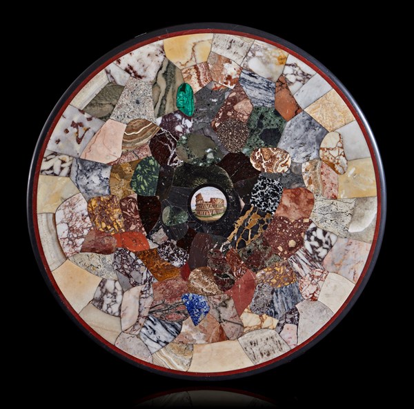Tavolino con piano in commesso di marmi centrato da micromosaico raffigurante il Colosseo (d. cm 57,5) Base tripode in bronzo brunito, gambe decorate all'attacco da busti e terminanti a piedi ferini in bronzo dorato (h. cm 55)