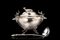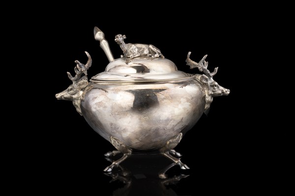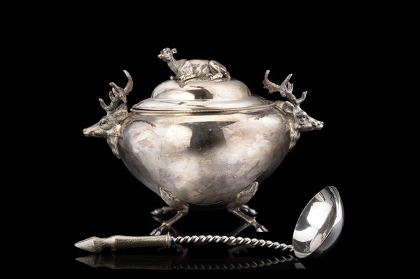 Zuppiera biansata in metallo argentato con presa del coperchio a cervo a tutto tondo e anse zoomorfe. Piedi a zoccolo (cm 30x23) (restauri) Con mestolo analogo