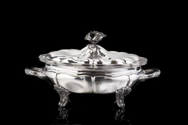 Zuppiera biansata in argento di forma mossa con presa a fiori a tutto tondo. Bordure cordonate, anse e piedini cesellati a volute (L. cm 46) (g 3000)