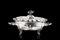 Zuppiera biansata in argento di forma mossa con presa a fiori a tutto tondo. Bo