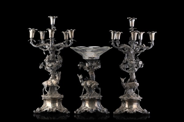 A 19th-century Milanese silver centerpiece comprising a pair of six-light candle holders and a stand with glass dish decorated with deers. Bottega Brusa (h. max cm 60) (g net 8300 ca.) (defects)