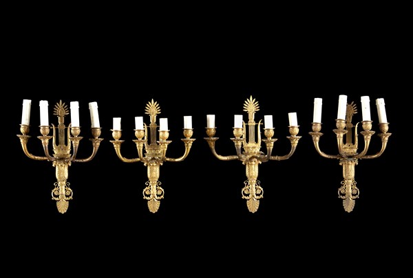 Gruppo di quattro applique in bronzo a quattro fiamme con braccia sagomate e cesellate a fiori, palmette e volute. Reggibraccia traforato a lira e decorato a elementi vegetali. Secolo XIX (h. cm 38) (difetti)