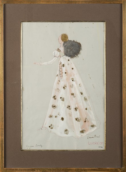 "Lucrčce" mixed media on paper (cm 49x31), signed and titled lower right and inscribed "Viviane Everly" lower left. In frame (defects)