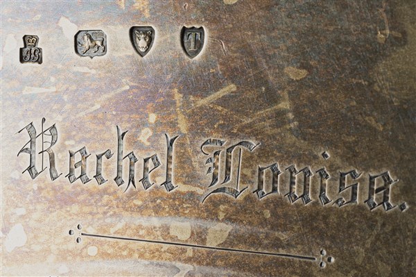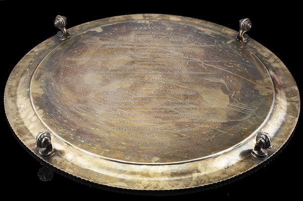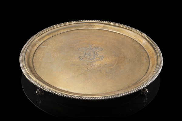 Centrotavola in vermeille poggiante su quattro piedi a ricciolo, bordo a motivo cordonato, cavetto centrato da stemma con motto "do it with thy might" e iscrizione dedicatoria "Thomas Fowell and Rachel Jane Buxton from their 52 descendants on their Golden Wedding. 4th february 1895". Al retro iscritto con i nomi dei discendenti. Londra, 1894. Argentiere James Garrard (d. cm 63,5xh. cm 5,5) (g 6145) (lievi difetti)