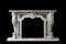 Camino in marmo bianco con piano sagomato. Montanti mossi a volute, foglie d'ac