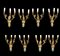 Gruppo di otto applique a tre fiamme in bronzo dorato con reggicandele a forma