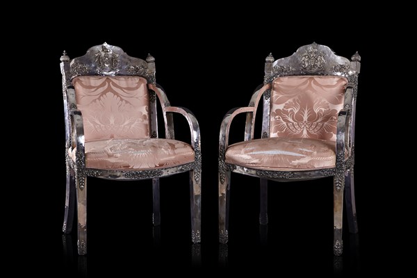 Coppia di poltrone di forma mossa rivestite in lamina d'argento decorato a rilievo con fregi e volute, schienali centrati da stemma. India coloniale, inizio secolo XX (difetti)