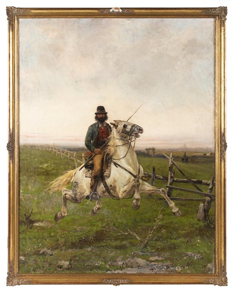 "Figure on horseback with Rome in the background" oil on canvas (cm 132x100) signed and dated 1883 on the right. In frame (defects)