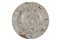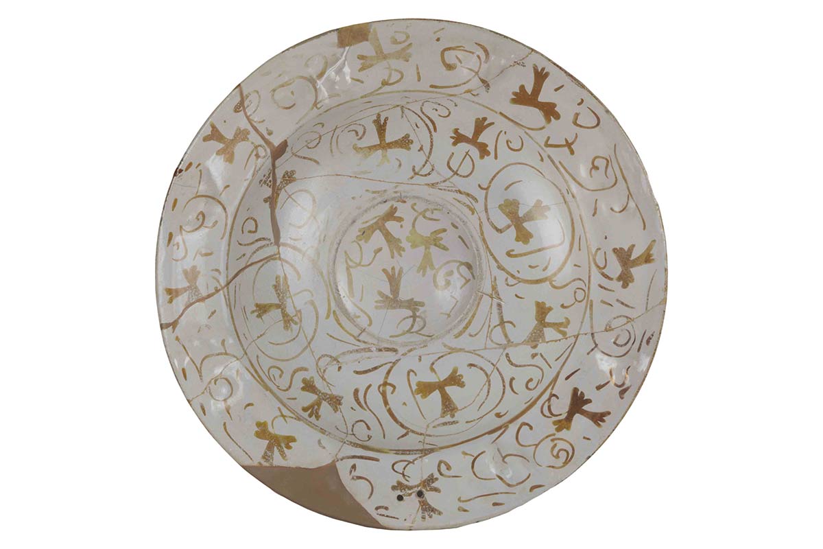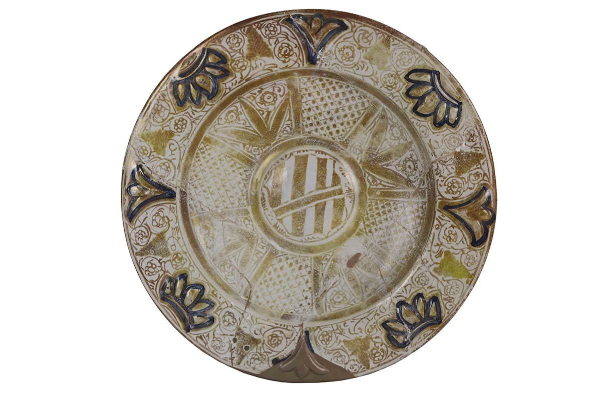 Piatto in maiolica a larga tesa, stretto ingiro ed ampio cavetto piatto, dipinto a lustro oro e blu: in tesa decorazione miniaturistica a lustro oro e suddipinta in blu con quattro semicorolle inframezzate a quattro boccioli semiaperti; in cavetto, solo a lustro oro, quattro settori puntinati fra quattro settori fitomorfi; nel centro leggermente umbonato, Stemma di Valencia, città spagnola famosa per le maioliche lustrate. Nel verso, decorazione a tutto campo in lustro oro con foglie di prezzemolo alternate ad elementi filiformi di varia fantasia.