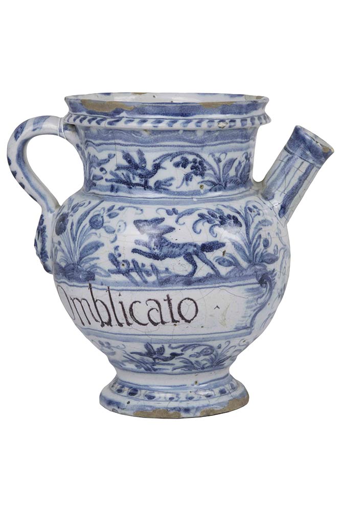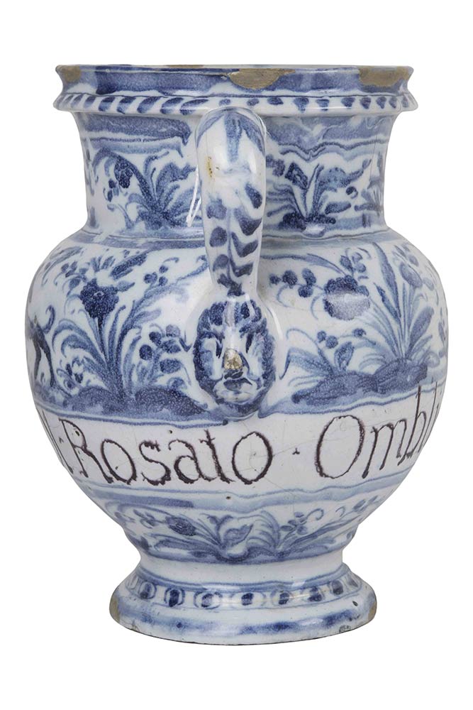Brocca con manico e cannello versatore; nel bordo incastro per coperchio. Maiolica dipinta in “Stile calligrafico” in monocromia blu su fondo bianco; nel collo decori fitomorfi; nella pancia Cani in corsa, fra cespugli e più in basso cartiglio con scritta in marrone: OL. ROSATO. OMBLICATO. Il manico termina a forma di Viso in rilievo.
