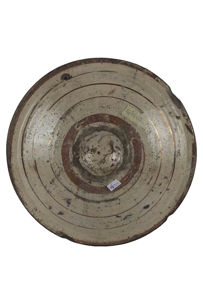 Piatto a larga tesa e cavetto umbonato; decori in lustro dorato; in tesa motivi geometrizzanti; al centro umbone con abrasioni.