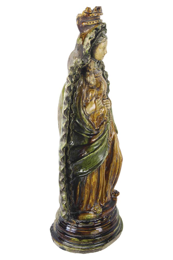 Statua della Madonna del Rosario, in maiolica policroma; è in piedi su complesso piedistallo in maiolica e sostiene con la mano sinistra il piccolo Gesù che poggia un piedino su una fascia verde la quale sale dalla vita verso la mano destra dove la Mamma tiene il rosario. Le avvolge il capo, su cui poggia una torre, un lungo mantello azzurro, per poi scendere ai lati delle spalle; è formato da due elementi ad onde come rose, ed è aperto sulla lunga veste rossa. Attorno al volto e sul collo è adorna di perle. Figurazione molto complessa che richiama i ricchi stilemi stilistici del barocco andino, chiamato “Stile di Cuzco”. Come si nota, la figura della Madonna, pur partendo dall’iconografia europea della Madre divina, è adattata al folclore locale, secondo quei caratteri autoctoni di cui fu massimo rappresentante Diego Quispe Tito (1611-1681), determinando le basi del “Barocco Andino” o Scuola di Cuzco. Nel retro molti vuoti per alleggerire la struttura e per inserimento.