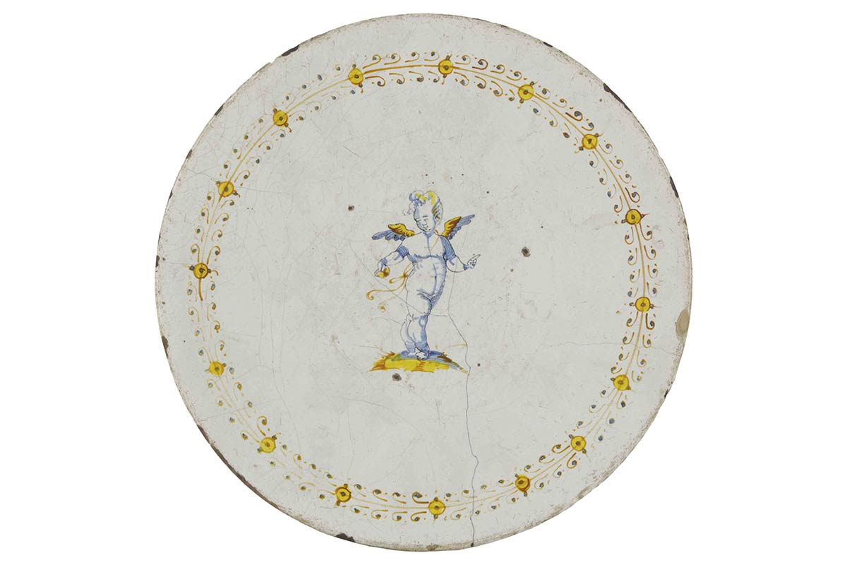 Alzata, in maiolica compendiaria con “Amorino corrente” STATO DI URBINO, sec. XVI, metà e terzo quarto.