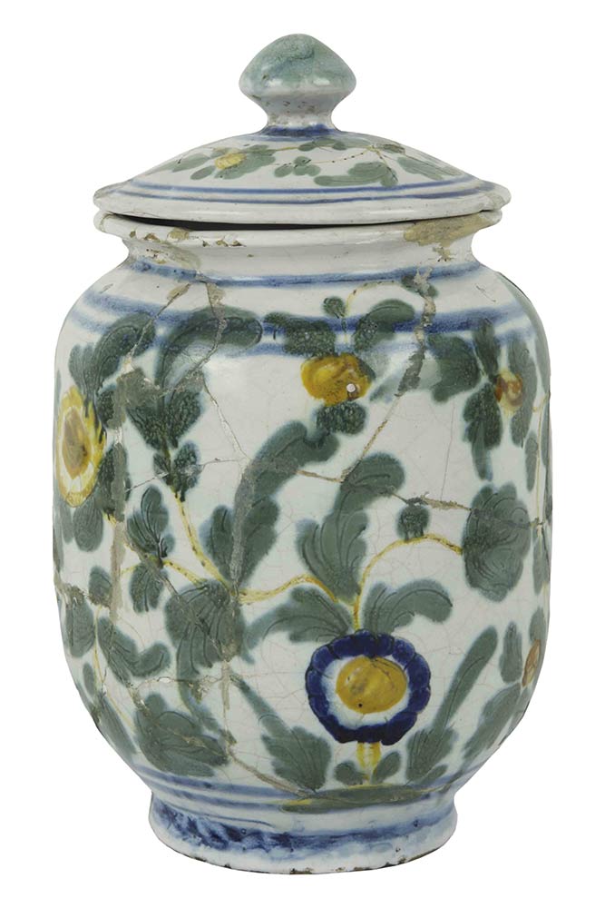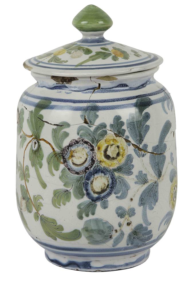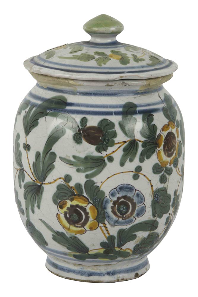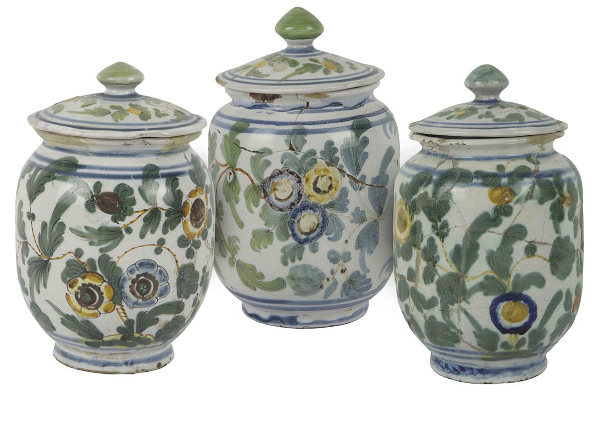 Tre albarelli con coperchio PESARO, Fabbrica Casali Callegari, sec. XVIII, seconda metà.