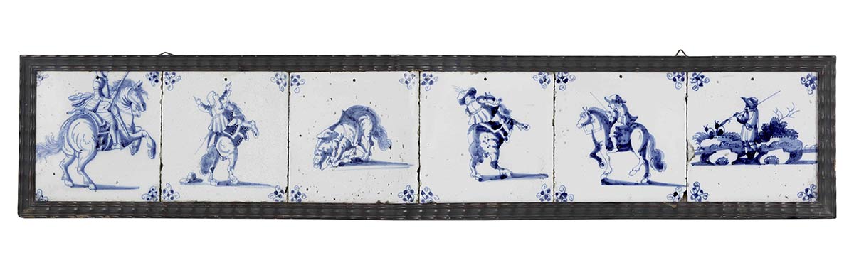 Pannello ligneo che lega sei piastrelle in maiolica dipinta in blu su bianco con negli angoli di ognuna motivi a testa di ragno e al centro una Figura diversa per ogni piastrella. Nel retro, timbro “Della Chiara”, riferito ad Alcibiade Della Chiara, (1904-1972), antiquario in Pesaro.