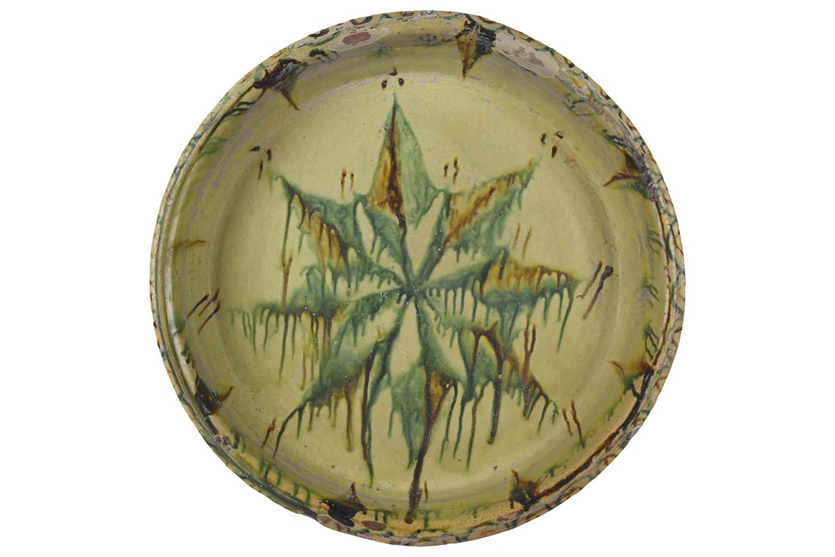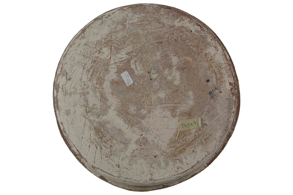 Grande catino a bordo sagomato, parete diritta ed ampio cavetto, in maiolica policroma con linee decorative nel bordo e nella parete; nel cavetto campisce una grande immagine assai complessa e suggestiva a doppia Stella con una specie di raggera sì da renderla una immagine mossa nel cielo; probabile Emblema di una farmacia. Parete esterna nuda.