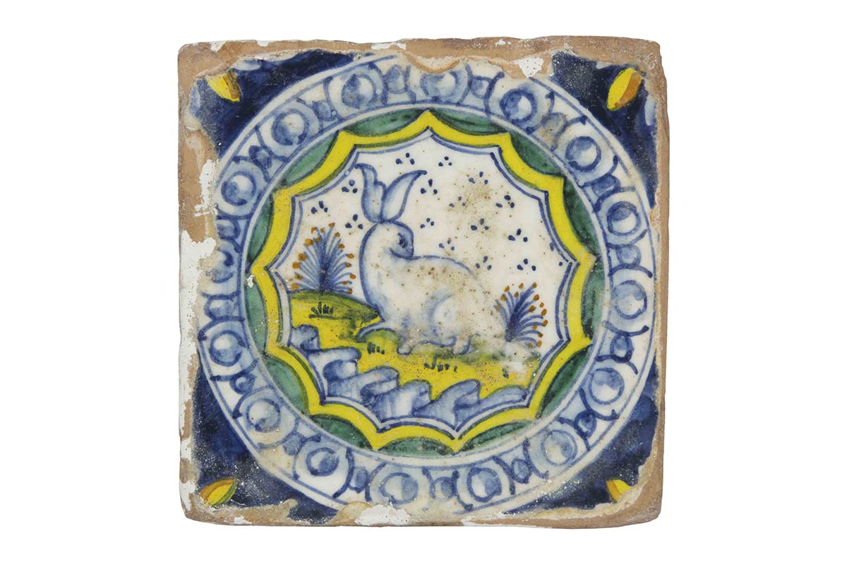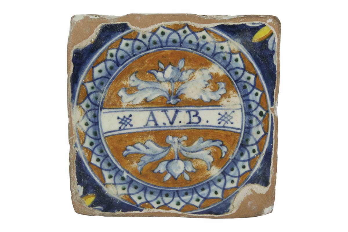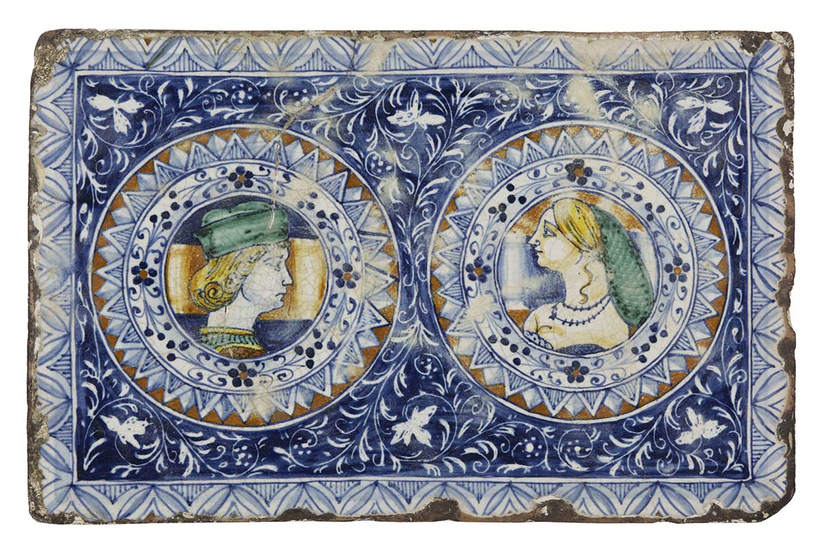 Nella piastrella rettangolare entro cornice ad archetti puntiti, tappeto blu-bianco su cui campiscono due grandi tondi con a destra Busto femminile che guarda verso l’altro tondo con Busto maschile, entro fasce geometriche e fitomorfe. Verso: nudo, anepigrafo.