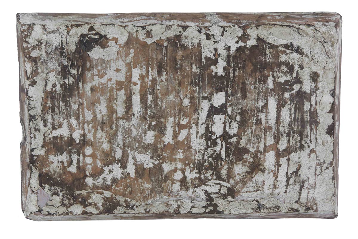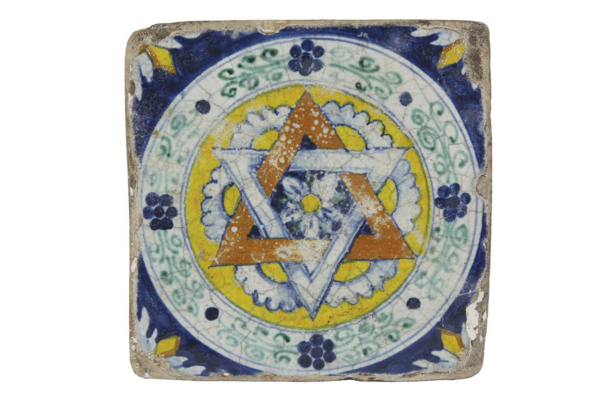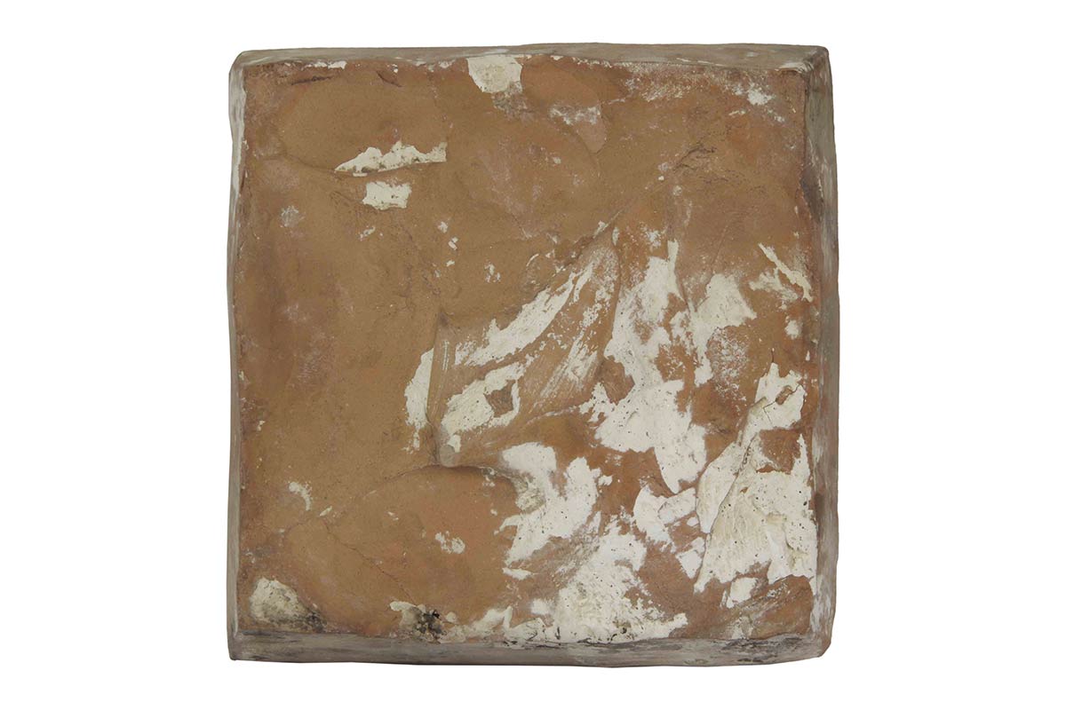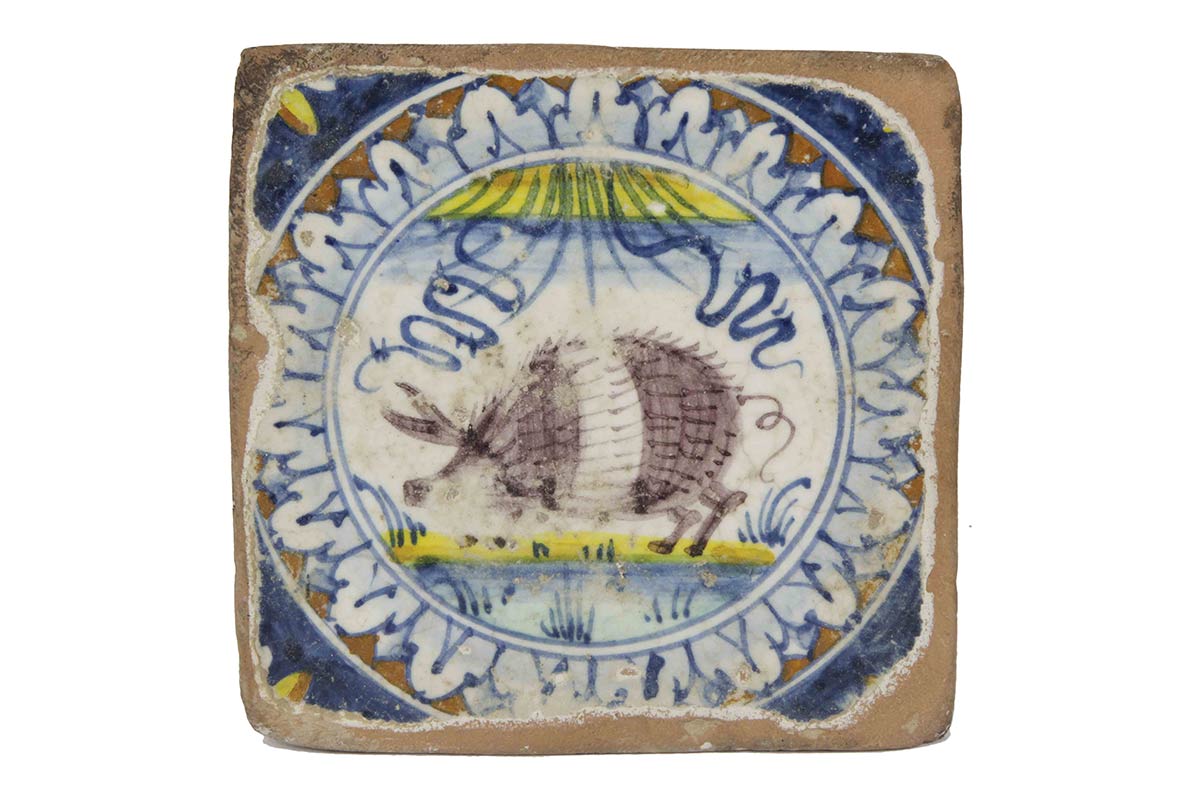 Nella piastrella rettangolare entro cornice ad archetti puntiti, tappeto blu-bianco su cui campiscono due grandi tondi con a destra Busto femminile che guarda verso l’altro tondo con Busto maschile, entro fasce geometriche e fitomorfe. Verso: nudo, anepigrafo.