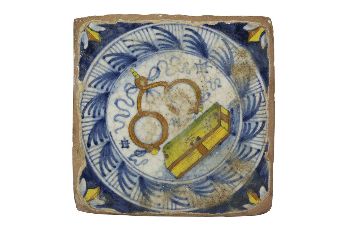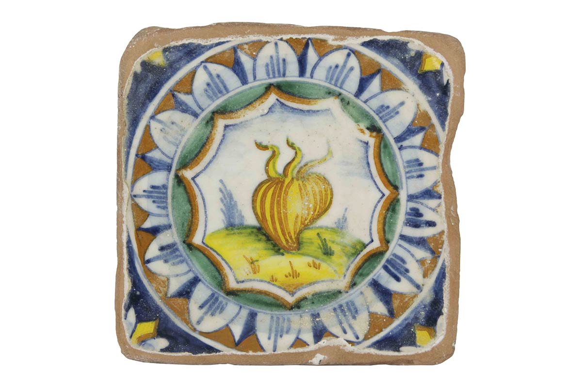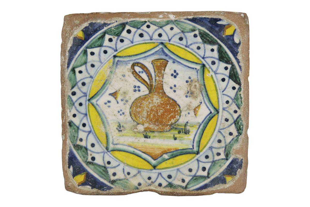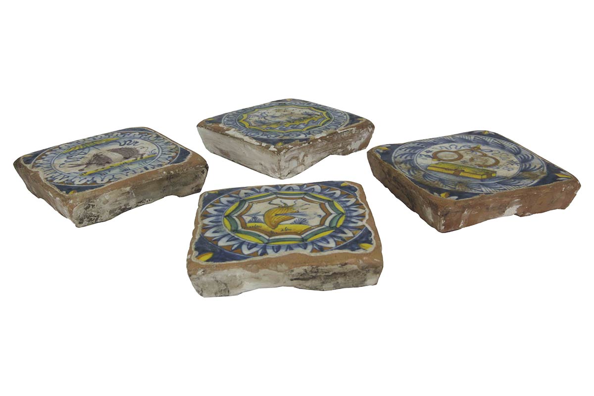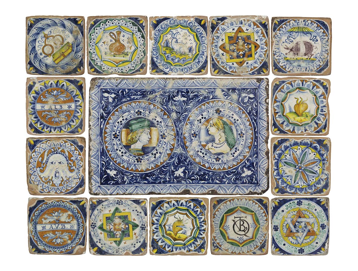 Serie di mattonelle in maiolica dipinte in policromia: 14 di forma quadrata ed una rettangolare. Nel recto ai lati delle quadrate, margherita che si compone dall’unione di quattro piastrelle e al centro entro nastro corrente di varia foggia: motivi geometrici e stellari zoomorfi, anagrammi, occhiali, cuore trafitto e fiammeggiante, mascherone.