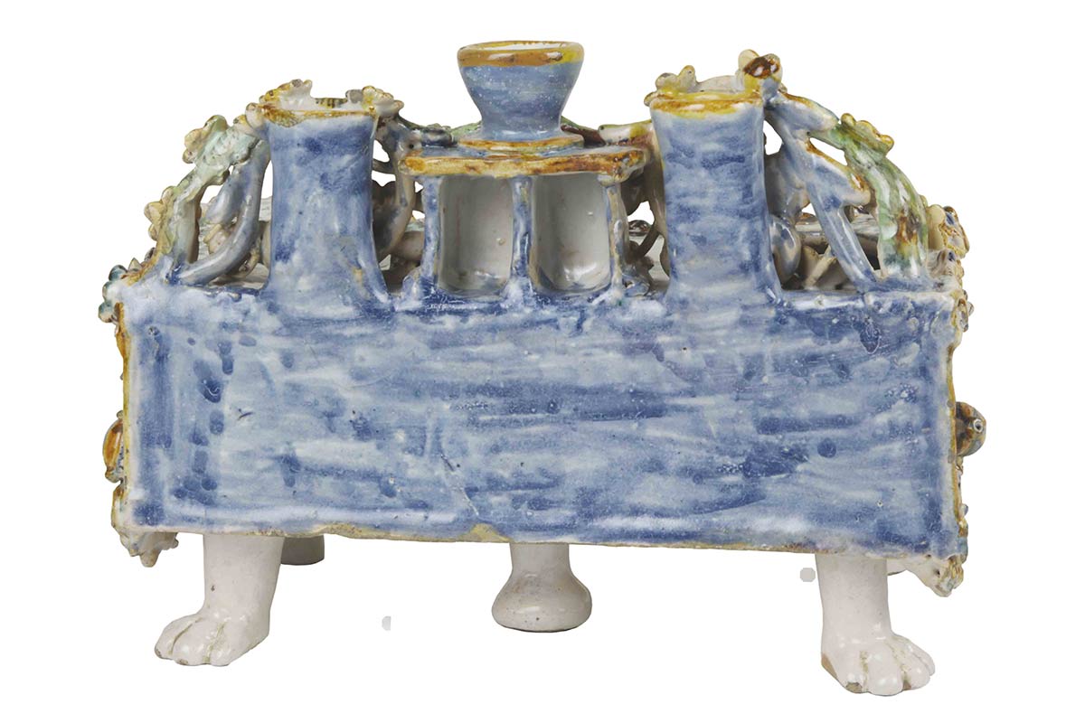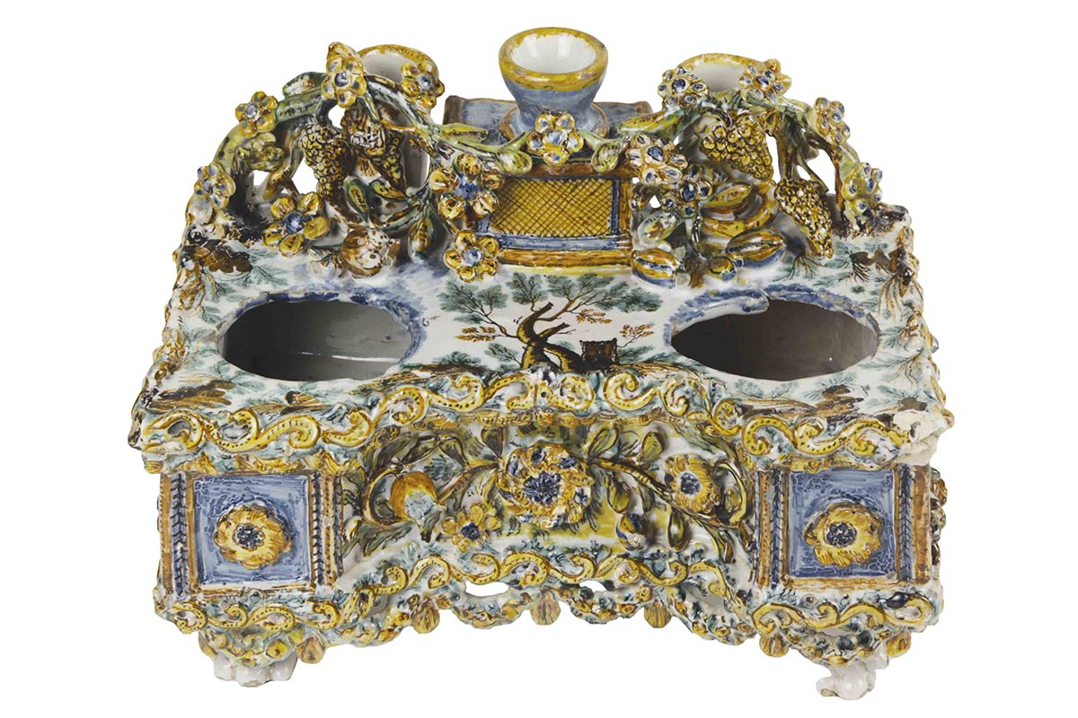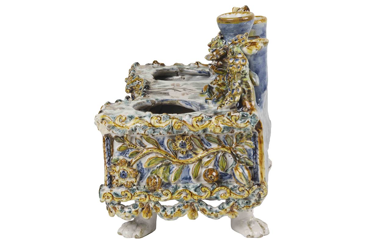 Calamaio in maiolica policroma sostenuto da cinque piedini, formato da una alta base a parallelepipedo con due buchi dove si inserivano i bicchierini per inchiostro; su questa si appoggia in verticale la parete con decorazioni di varia foggia in rilievo divise al centro da una parte assai complessa, che termina con bicchierino per calamo o penna da scrivere. Tutta la struttura presenta una ricchissima decorazione policroma in rilievo molto varia, con una parte dipinta in policromia a prevalenza verde con un bel Paesaggio sulla superficie con i buchi per bicchierini; tocchi dipinti in verde qua e là illeggiadriscono tutta la decorazione in rilievo a prevalenza giallo-arancio con fasce a girali, rosette di varia forma, fogliame e grappoli d’uva (?) nella parete ai lati di un rettangolo a graticcio.