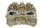 Calamaio in maiolica policroma sostenuto da cinque piedini, formato da una alta base a parallelepipedo con due buchi dove si inserivano i bicchierini per inchiostro; su questa si appoggia in verticale la parete con decorazioni di varia foggia in rilievo divise al centro da una parte assai complessa, che termina con bicchierino per calamo o penna da scrivere. Tutta la struttura presenta una ricchissima decorazione policroma in rilievo molto varia, con una parte dipinta in policromia a prevalenza verde con un bel Paesaggio sulla superficie con i buchi per bicchierini; tocchi dipinti in verde qua e là illeggiadriscono tutta la decorazione in rilievo a prevalenza giallo-arancio con fasce a girali, rosette di varia forma, fogliame e grappoli d’uva (?) nella parete ai lati di un rettangolo a graticcio.