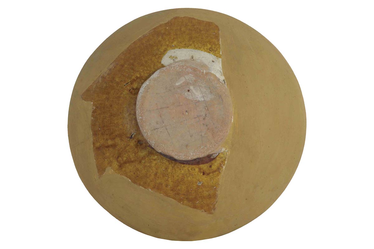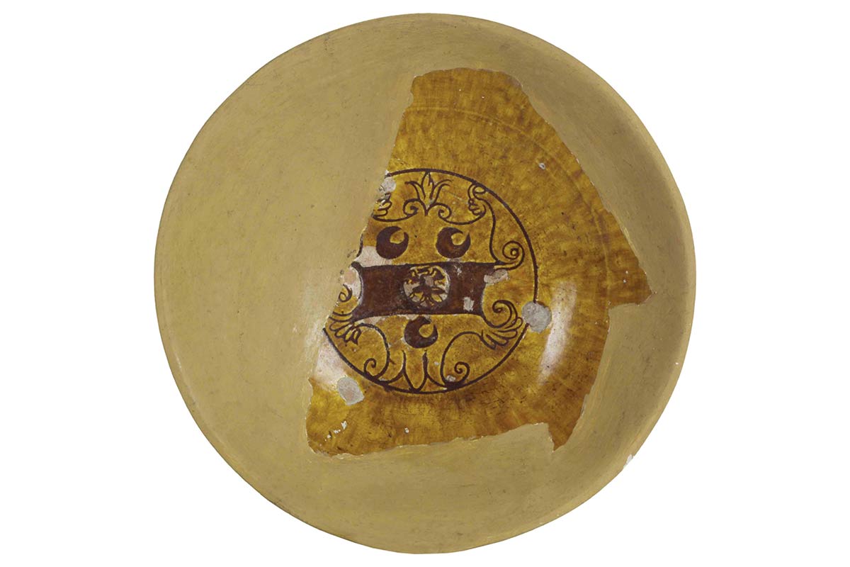 Piccola ciotola in ceramica di colore lionato, è campita a graffito con lo stemma dei Tolomei: D'azzurro alla fascia d'argento accompagnata da tre crescenti dello stesso, due in capo ed uno in punta; in cuore, attraversante sulla fascia, uno scudetto d'oro, caricato d'un'aquila coronata di nero.