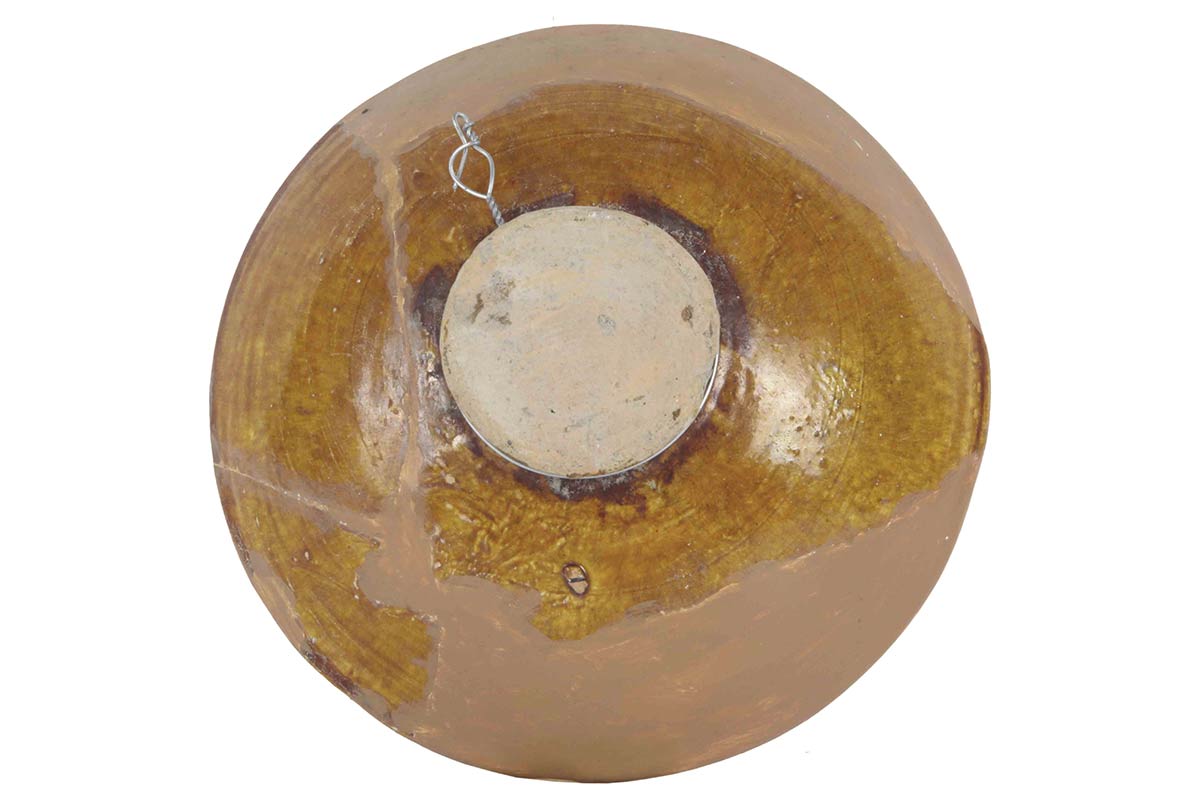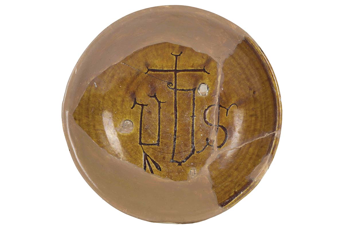 Ciotola in ceramica con orlo cordonato in color lionato; al centro reca in marroncino la scritta cristologica I H S, di antico segno bernardiniano, qui reso con una stilizzazione geometrizzante a linee sottili molto bella e rara.