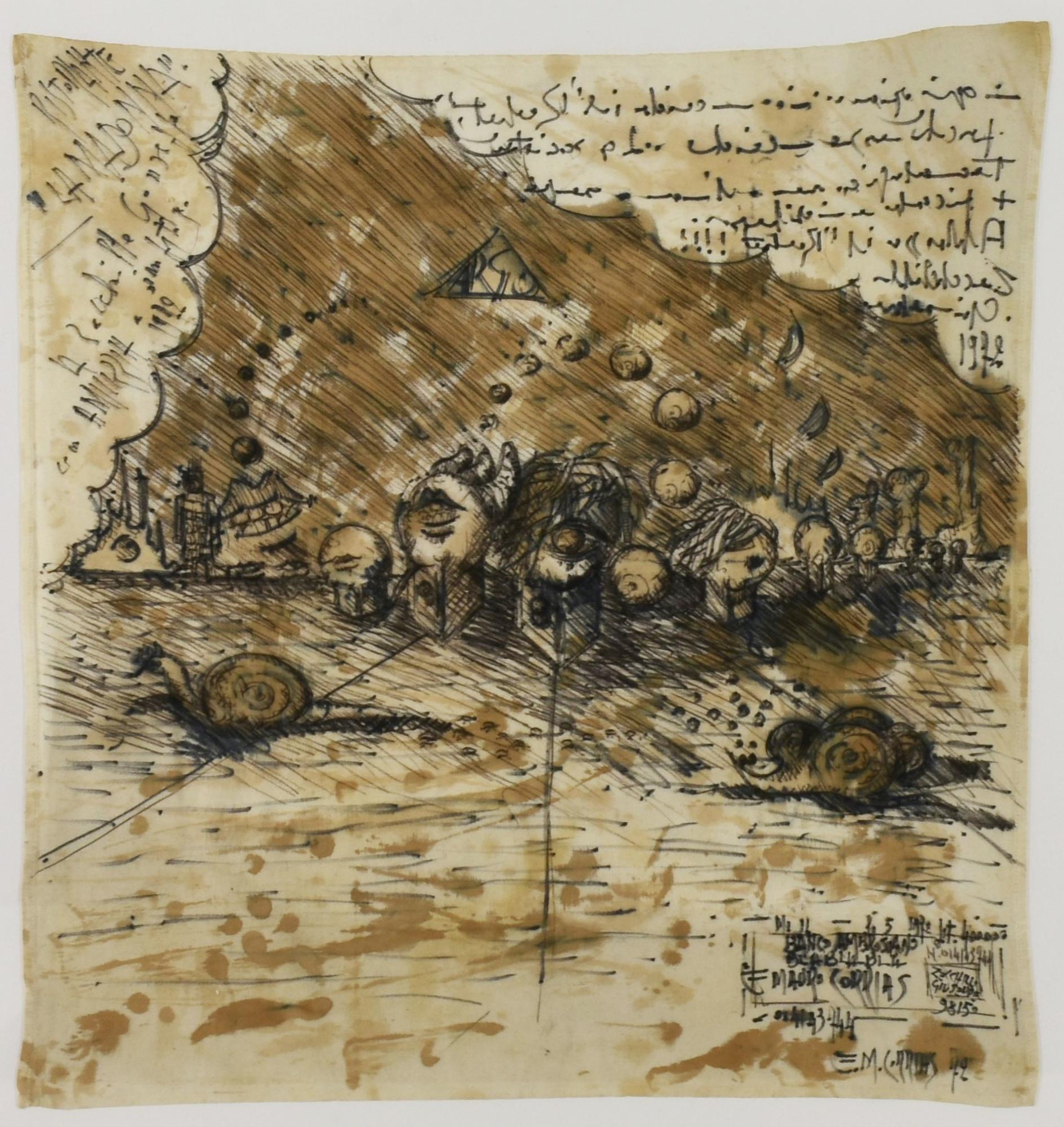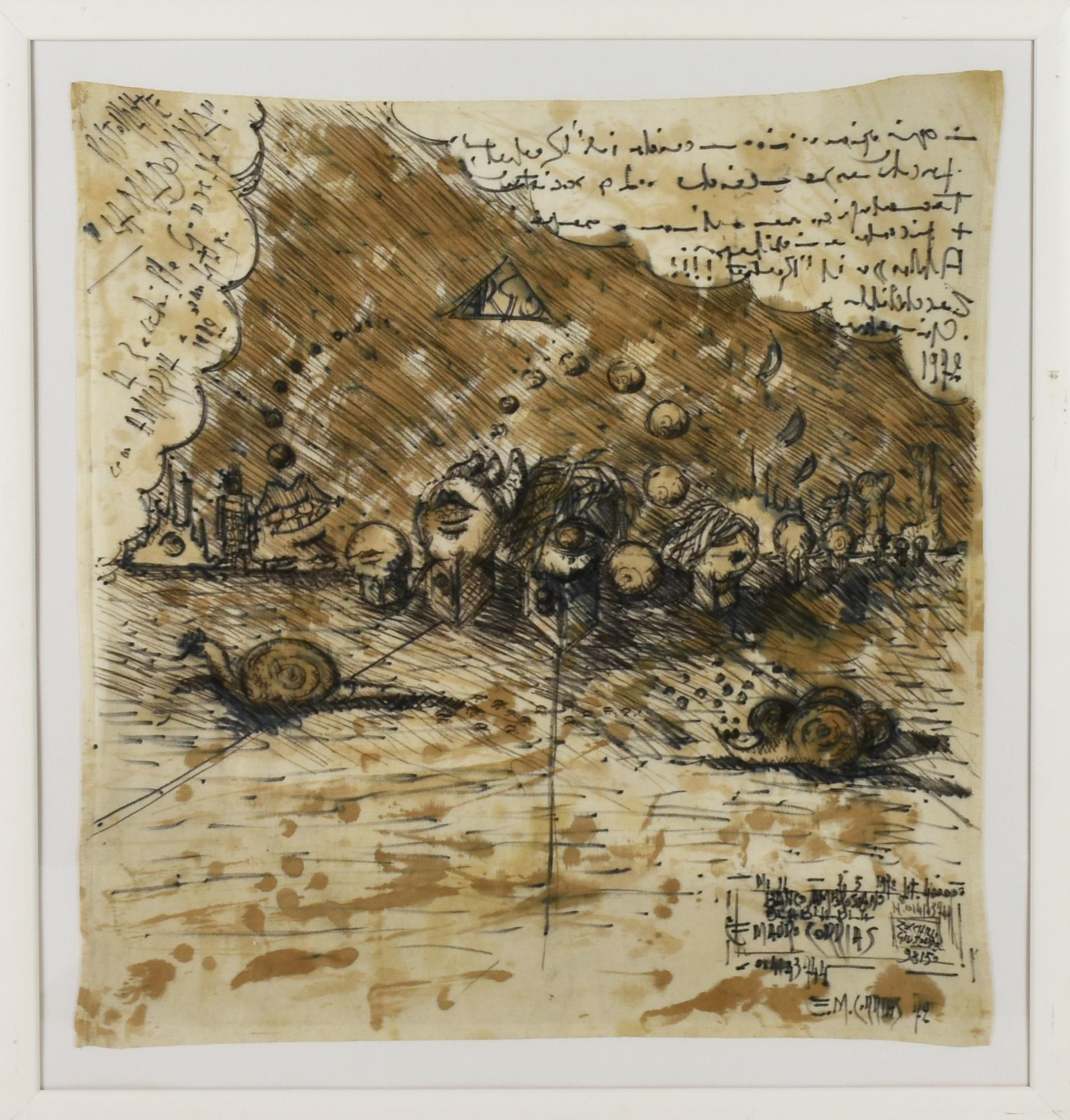 Mauro Corrias RISTORANTE LA MADONNA pennarello su tessuto, cm 51x49 firma,...