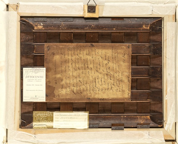 Al retro una dedica dell’artista su carta fissata su tavola e l’etichetta della Galleria d’arte Pirra di Torino