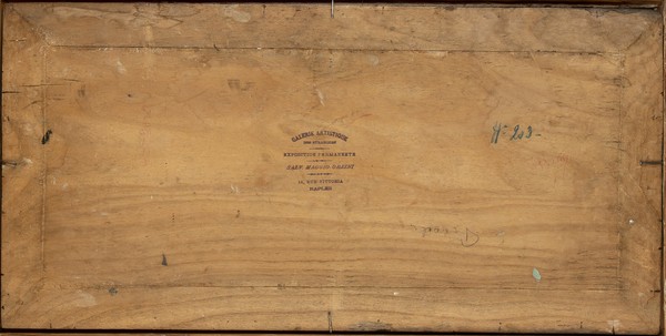 Firmato in basso a sinistra “G. Laezza”, titolo in alto a destra “Scena pescherecci”. Sul retro il timbro della Galerie Artistique des etrangers, Napoli