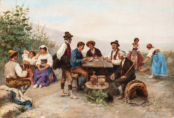 FRANCESCO BERGAMINI (Roma, 1851 - 1900): Partita a carte in campagna, XIX sec.