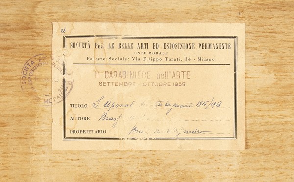 Firmato in basso a destra: “Italico Brass”. Sul retro, etichetta e timbro della “Società per le Belle Arti ed Esposizione Permanente di Palazzo Sociale di Milano”. Etichetta di “VIMARTE” di Brescia.