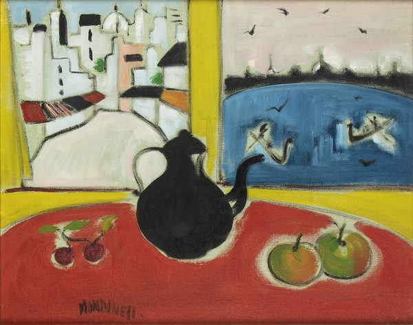 SANTE MONACHESI (Macerata 1910 - Roma 1991): Tavola rossa con teiera