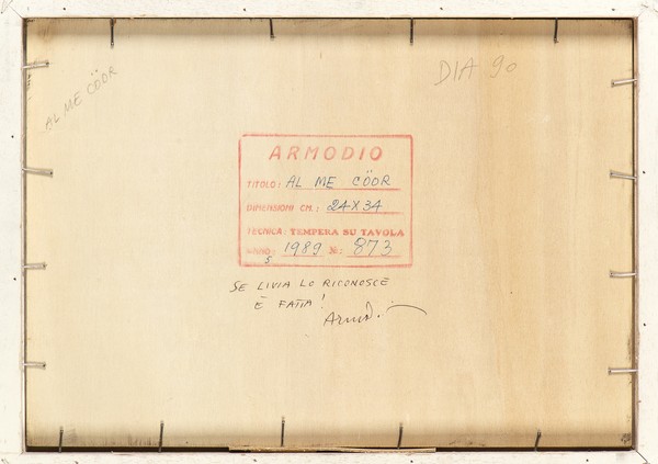 Firmato in basso al centro “Armodio”; al retro timbro con i dettagli dell’opera e dedica dell’artista con firma. Titolato in alto a sinistra “Al me cöor”.