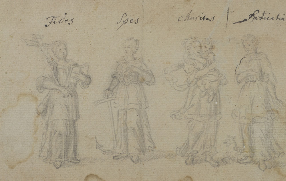 Scuola italiana del XVII secolo Quattro virtù Matita di grafite su carta mm....