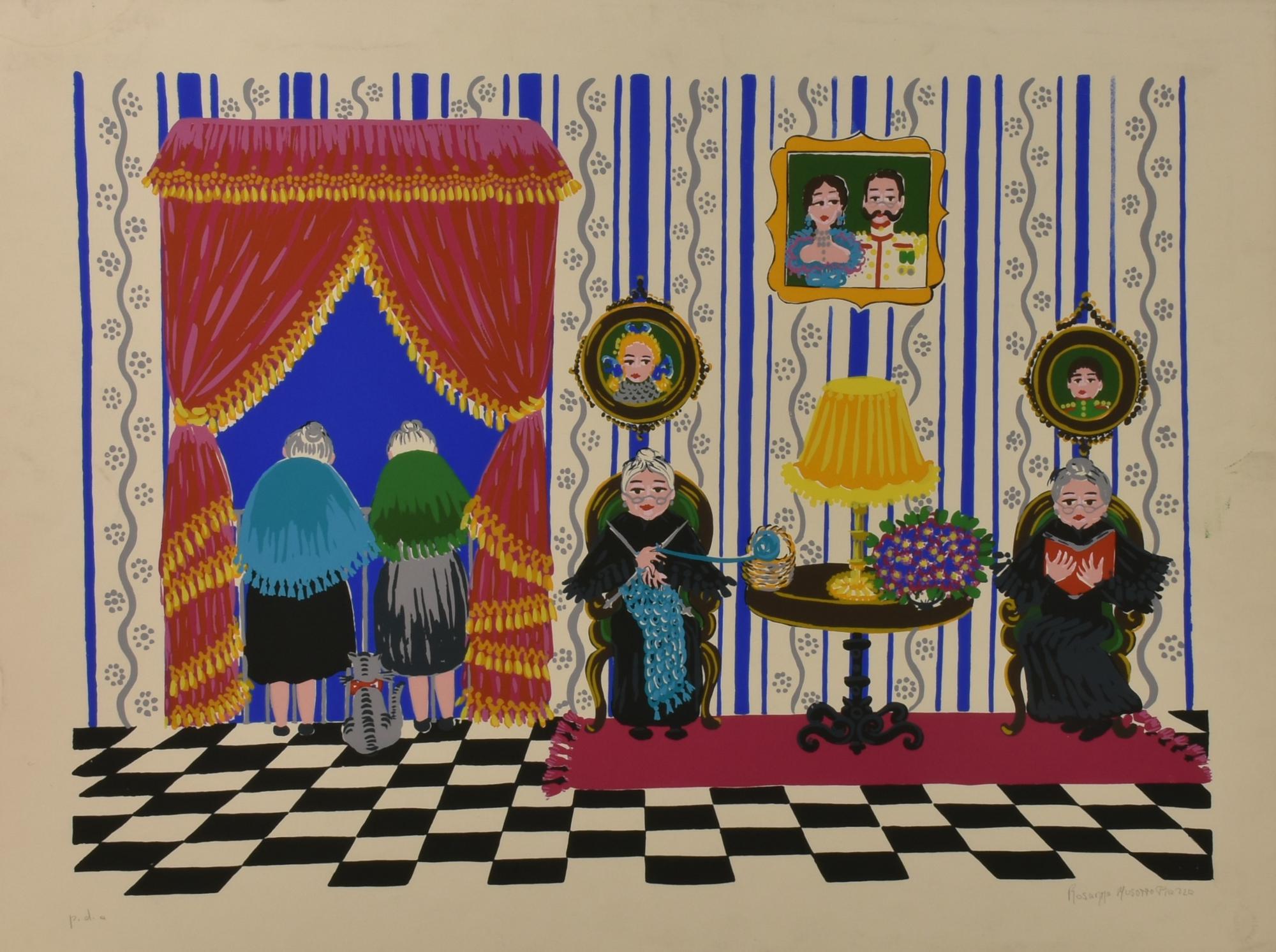 Rosanna Musotto Piazza ATTIVITA' DOMESTICA litografia su carta, cm 70x90, es....