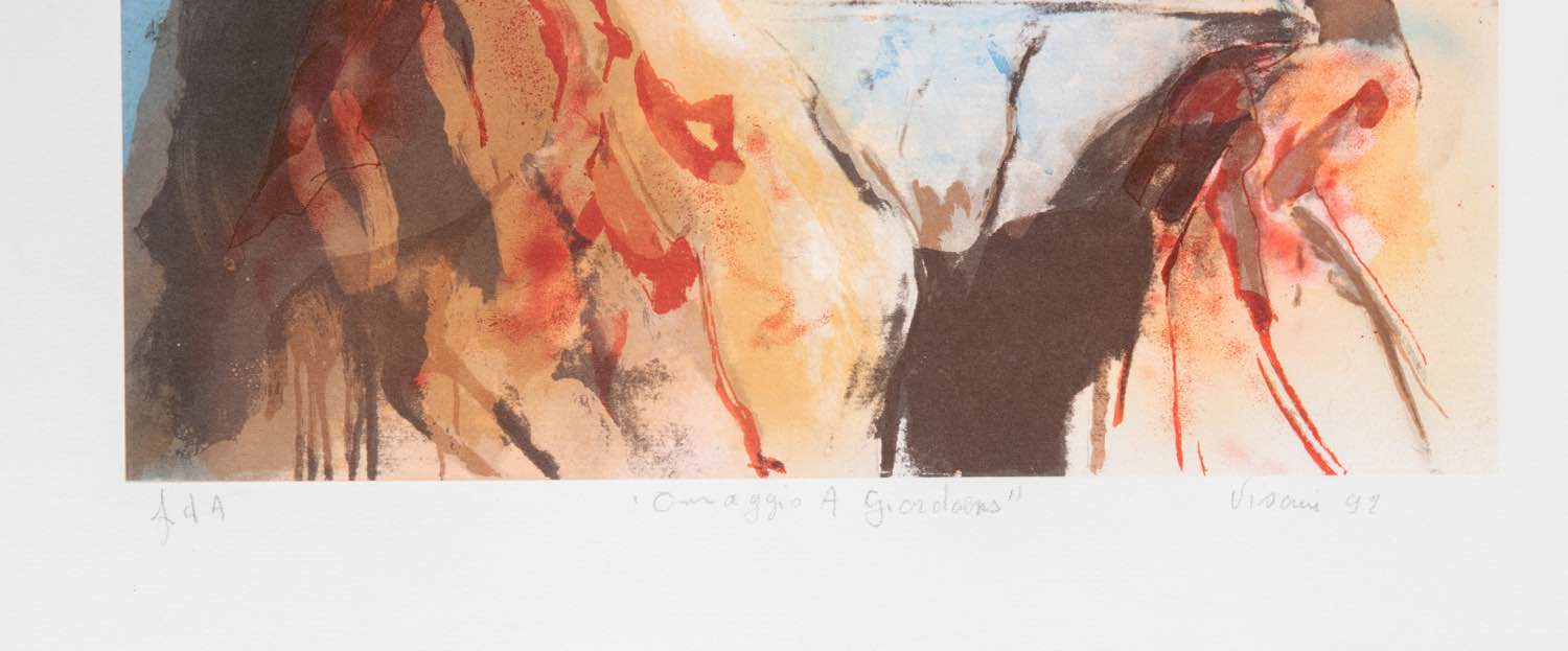 Litografia a colori su carta, firmata e datata in basso a destra Visani 92, esemplare in basso a sinistra p.d.a., titolo in basso al centro ‘Omaggio a Giordaens’, H 70x49