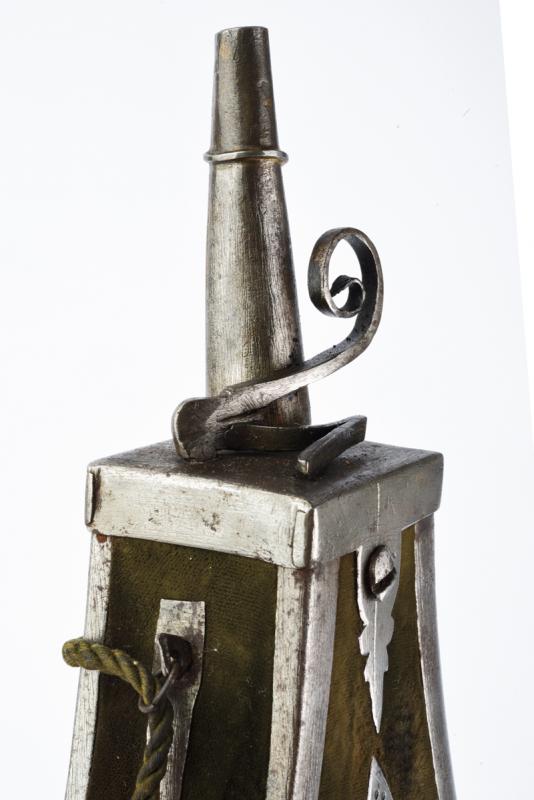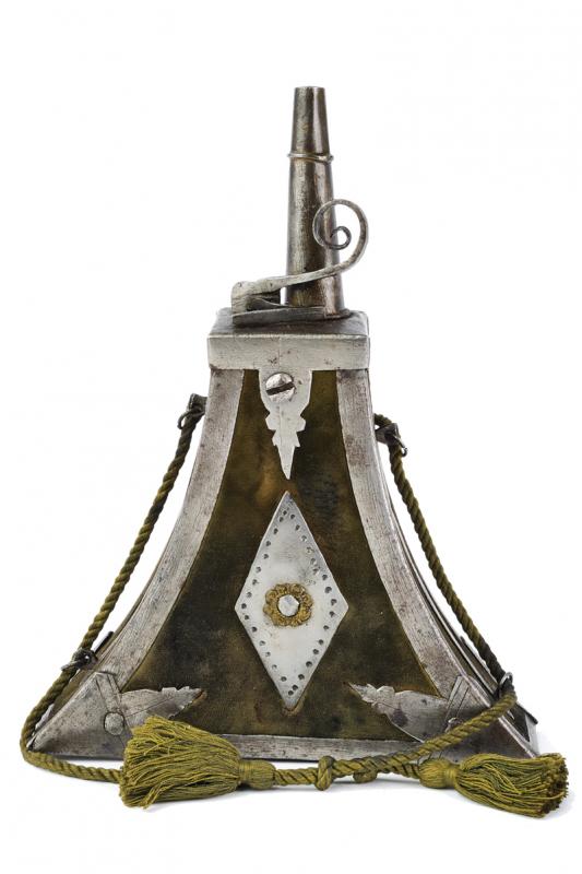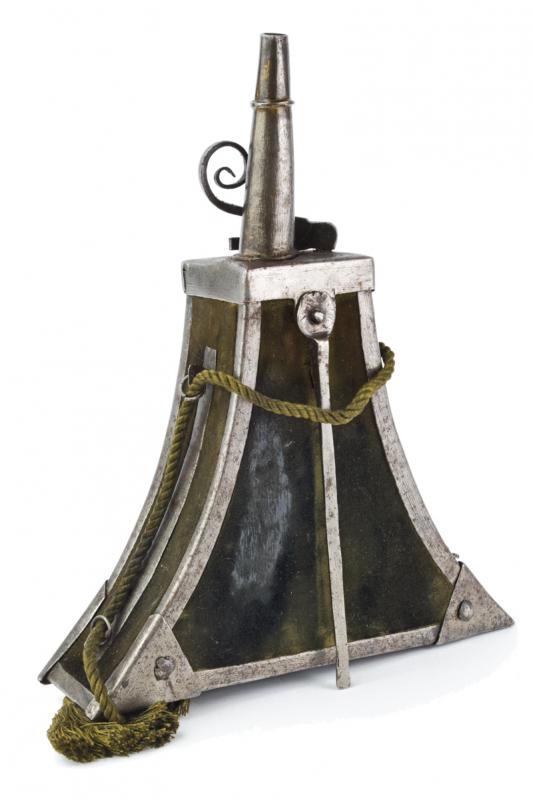 Fiasca da polvere da moschettiere, datazione: XVII Secolo provenienza: Germania, Di tipica forma con ampia base rastremata verso l'alto, tutti i bordi rivestiti da bande in ferro tenute da placche sempre in ferro agli angoli fissate con ribattini. Al centro della faccia anteriore un fornimento a losanga ornato al centro con un ribattino e una rosetta in ottone. Il corpo in legno rivestito di velluto, probabilmente di restauro. Sui fianchi quattro passanti con campanelle. Al dorso la chiusura con molla funzionante, il cannello troncoconico. Sul retro un lungo gancio da cintura. altezza 24 cm.