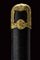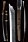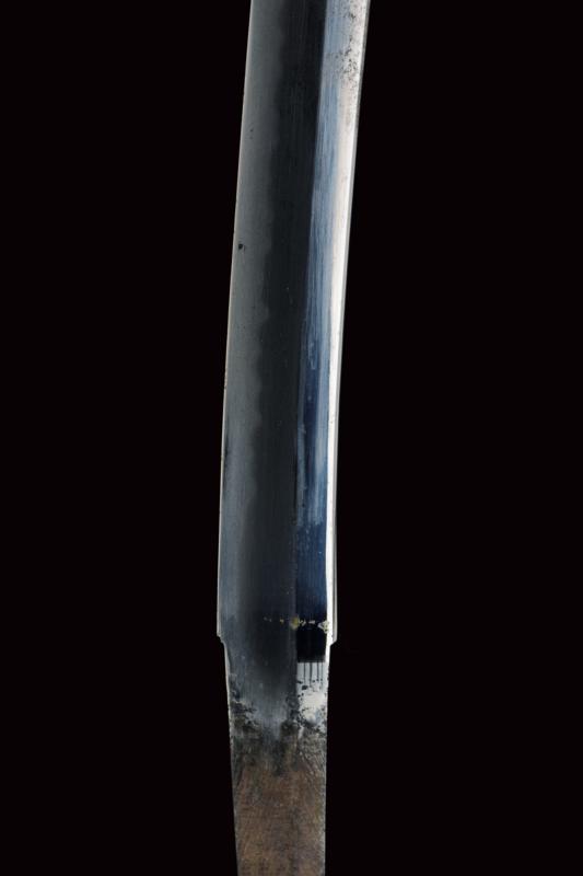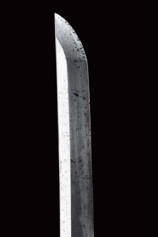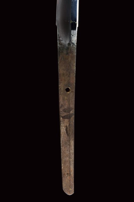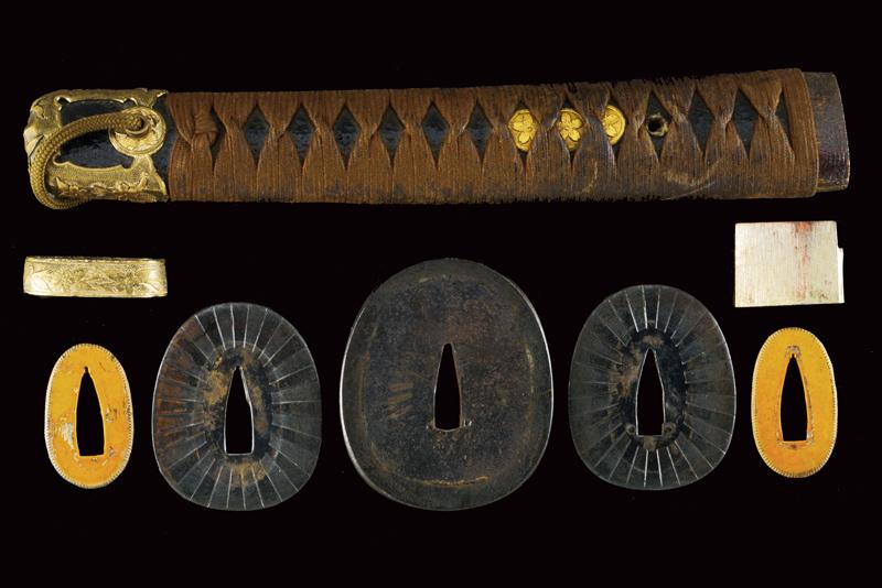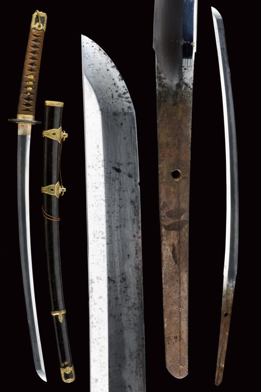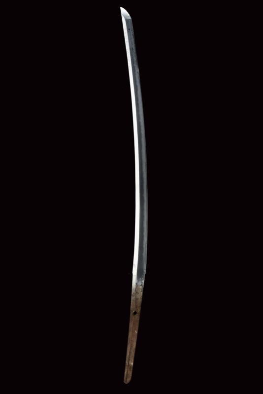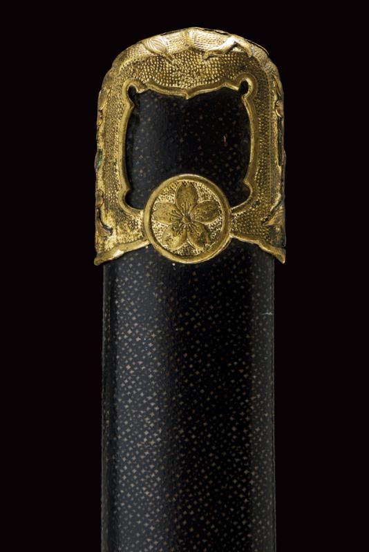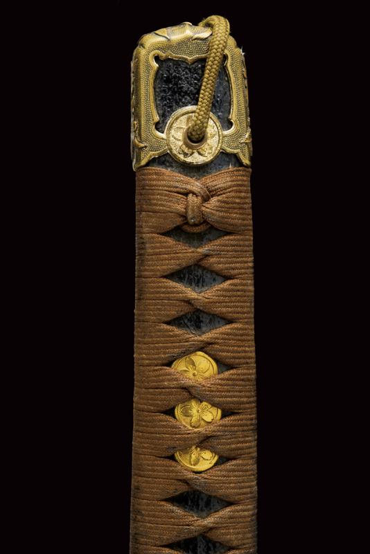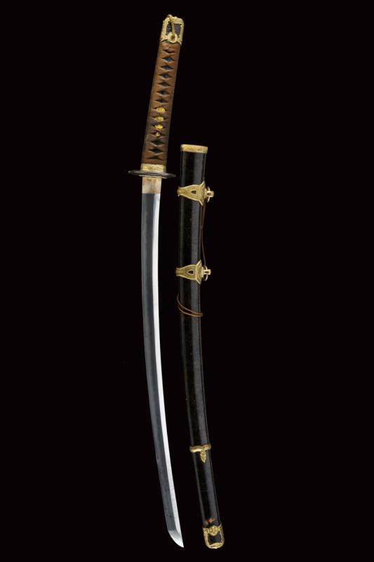 Bella katana da ufficiale (shin-gunto), datazione: 1940 circa provenienza: Giappone, Nagasa (lung. 58.9 cm) con hamon e hada visibile, piccola intaccatura vicino al boshi, habaki in rame con resti di argentatura. Nakago mumei con un mekugi-ana. Koshirae in shin-gunto completo di tsuba in ferro, fuchi, kashira e menuki in ottone inciso e tsuka in seta marrone. Saya in legno laccato (piccole mancanze vicino al puntale) con fornimenti in ottone decorato en suite. lunghezza 86 cm.