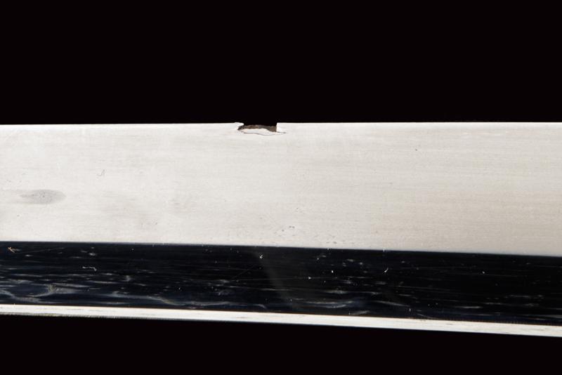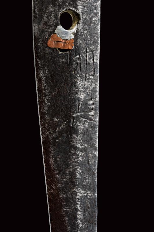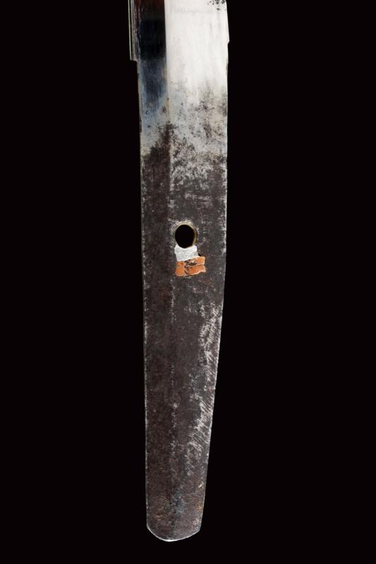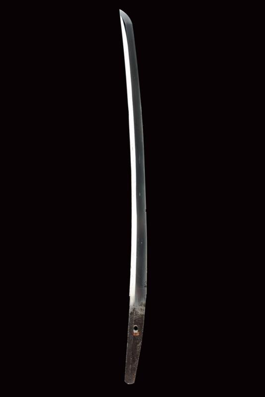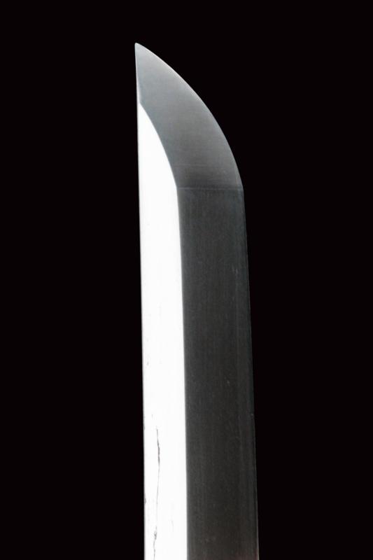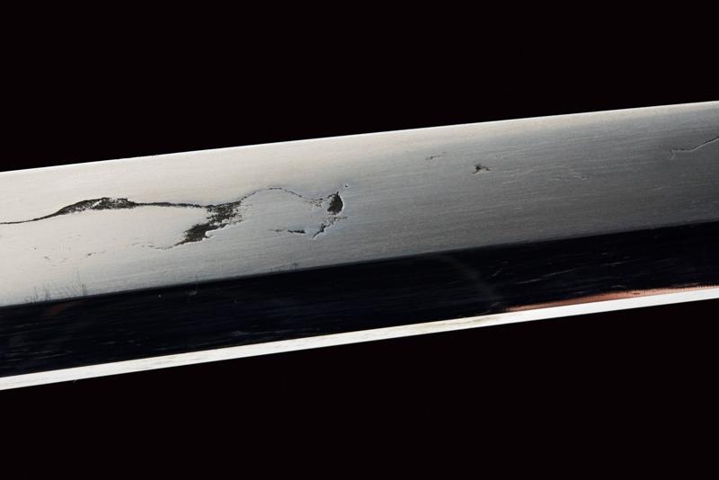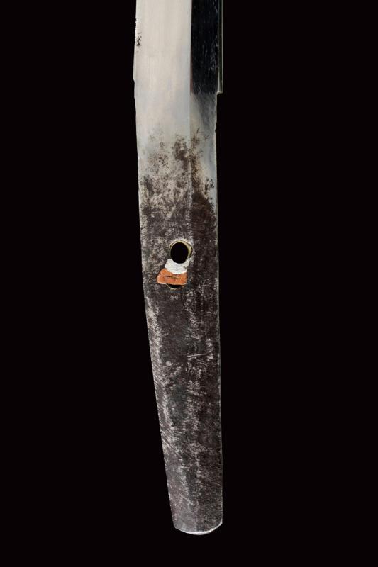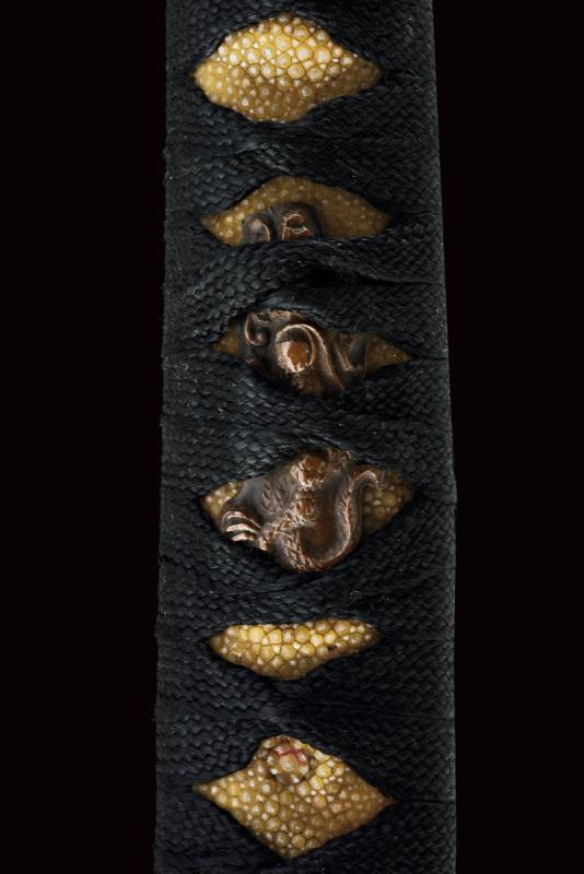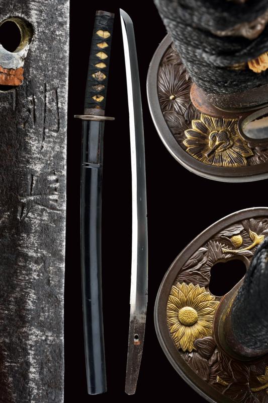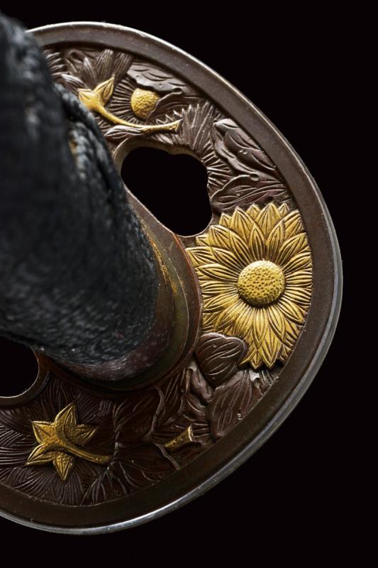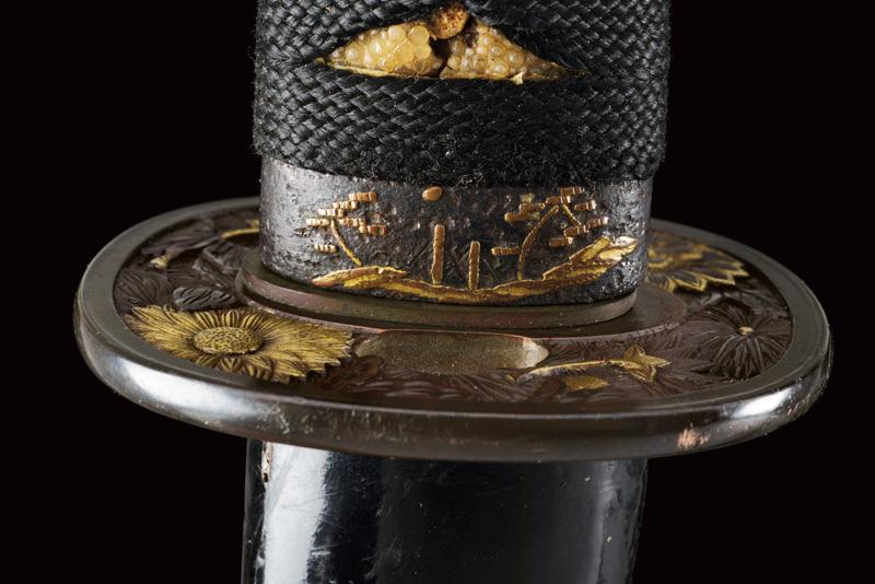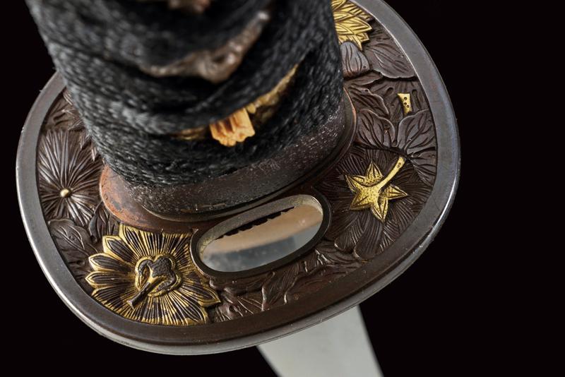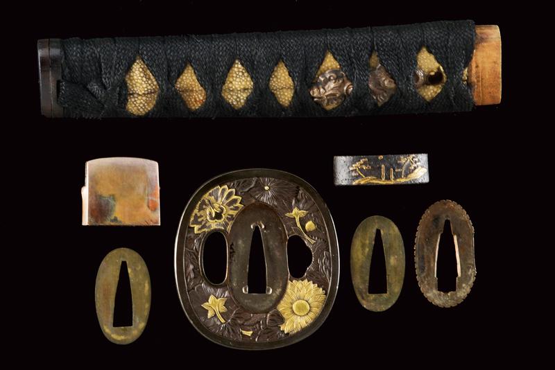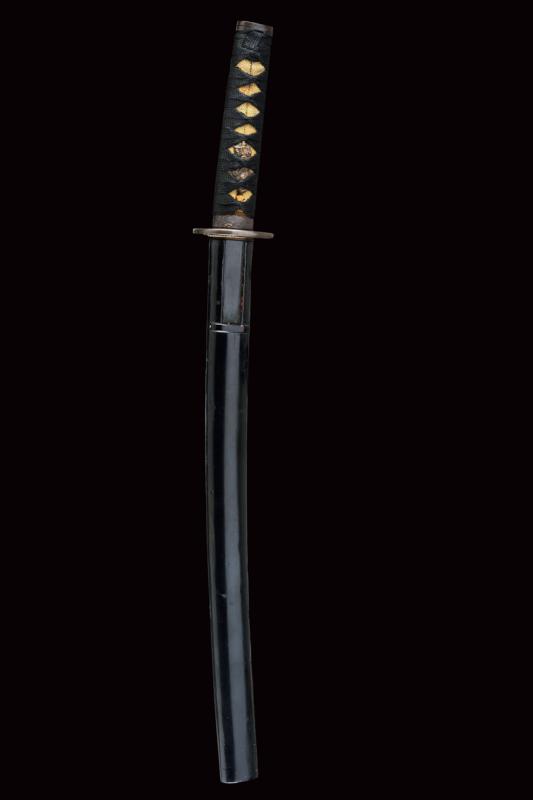 Wakizashi, datazione: Periodo Meiji (1868-1912) provenienza: Giappone, Lama shinogi zukuri (nagasa 42 cm), ubu nakago con due mekujgi-ana (uno richiuso in rame e resti di firma); habaki in rame, tsuba ovata in shakudo con intagli floreali rimessi in oro, fuchi kashira e menuki non omogenei, tsuka con tsuka-ito di restauro. lunghezza 60 cm.