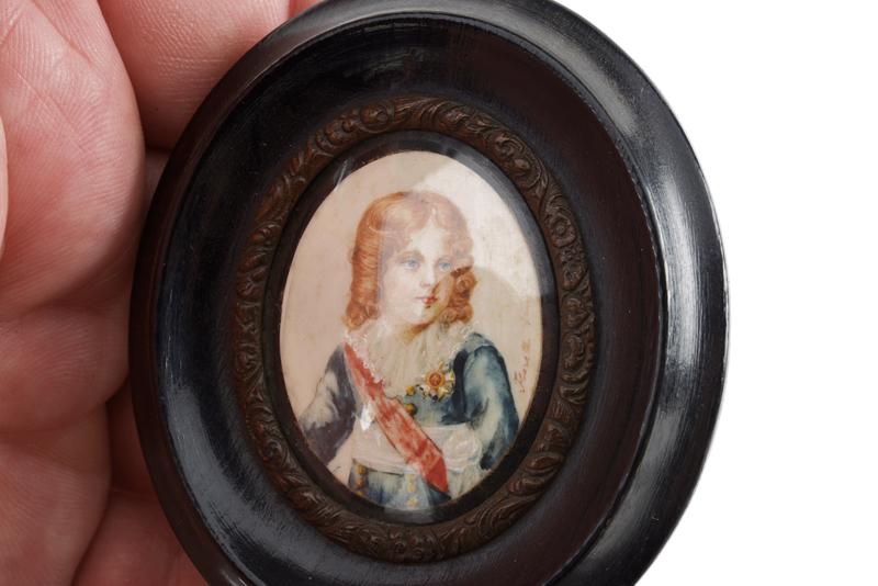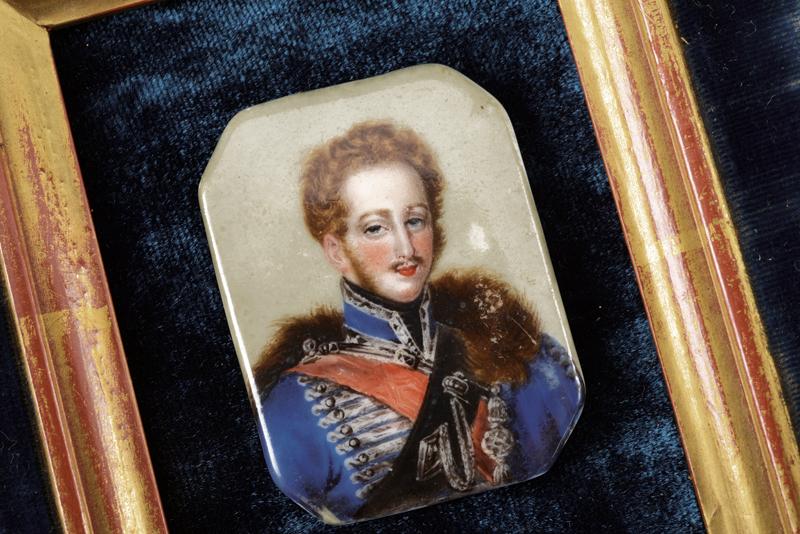 Lotto di due miniature, datazione: XIX Secolo provenienza: Europa, Un giovane principe (Re di Roma?) su ovale con firma in cornice e sotto vetro. L'altra miniatura raffigura un'ufficiale in uniforme blu con pelliccia, dipinto su porcellana. In cornice. dimensioni 3 x 4 - 3.4 x 4.6 cm.
