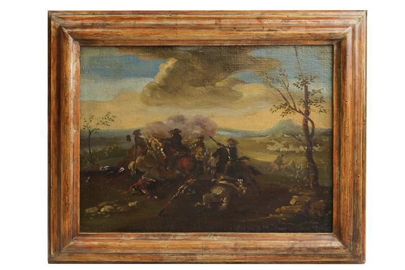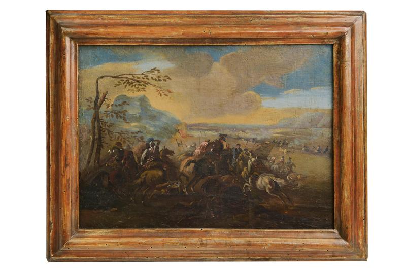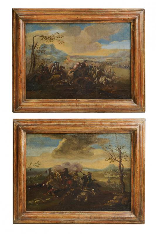 Coppia di dipinti a olio su tela, datazione: XIX Secolo provenienza: Italia, Tele raffiguranti scene di battaglia fra soldati a piedi e di cavalleria d'epoca seicentesca. Montati su cornice lignea. dimensioni tela 40 x 30 cm.