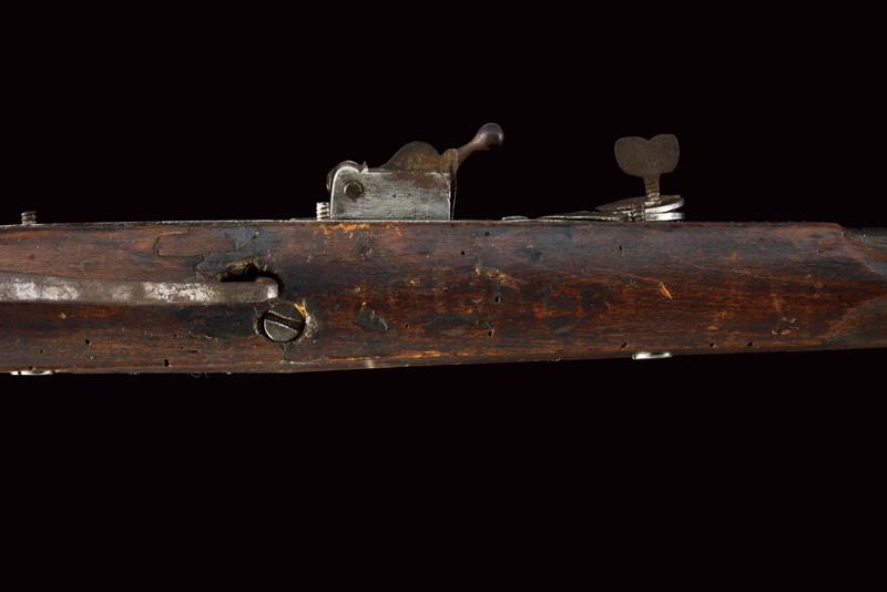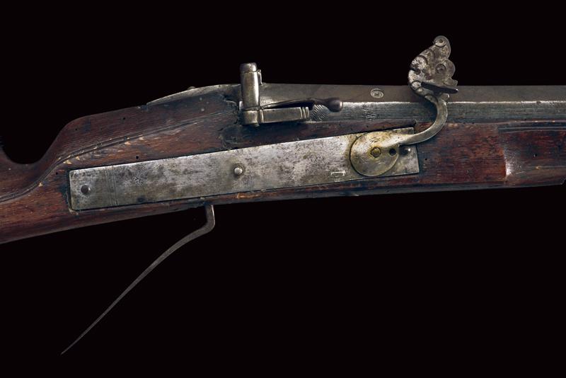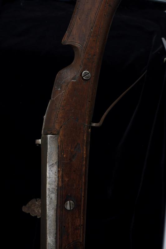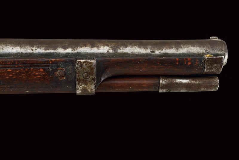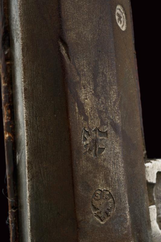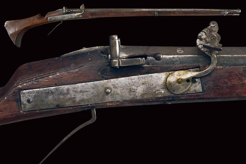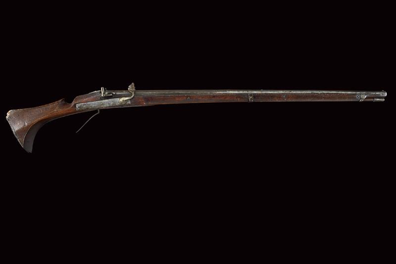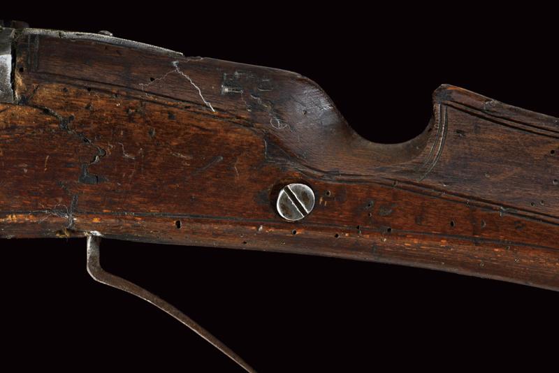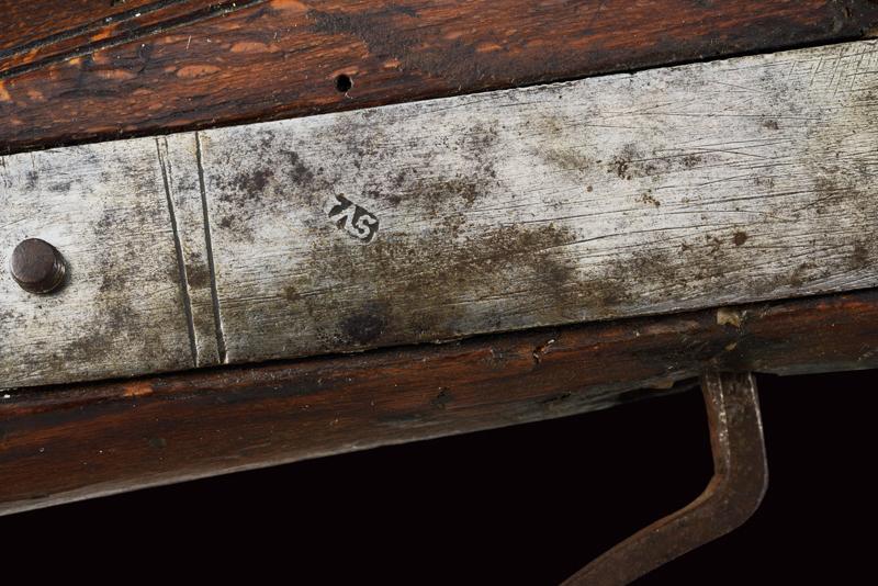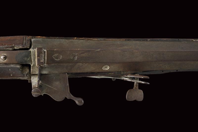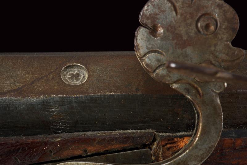 Interessante moschetto a miccia da forcella, datazione: Fine del XVI Secolo provenienza: Europa, Canna liscia a due ordini, ottagonale nel primo segmento e recante tre punzoni: marchio 'SK' sormontante un'aquila, uno scudo araldico, e un profondo bollo circolare recante una croce. Il secondo segmento di sezione tonda, con tre anellature al cambio e il mirino in volata. Cal. 18,3 mm. Lo scodellino completo di copriscodellino girevole e dotato anche di parascintille che si appoggia all'alzo. Codolo liscio. Batteria con meccanica funzionante. La cartella di forma rettangolare e liscia recante un punzone (TAS?) non chiaramente leggibile, la serpe con collo curvo e di forma palmata e lavorata a grottesca, completa di vite a galletto. Cassa antica in legno con frattura restaurata in tempi non recenti, mancanza al dorso della pala e fori di tarlo restaurati, ma di struttura ancora solida, ornata con doppie delineature. Due reggicanna in ferro. Bacchetta in legno probabilmente più recente con battipalla in ferro. lunghezza 155,3 cm.