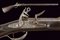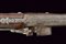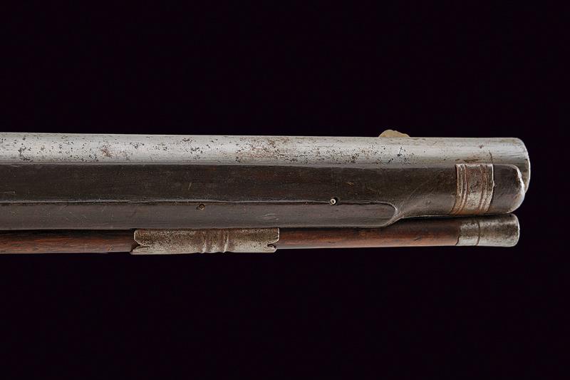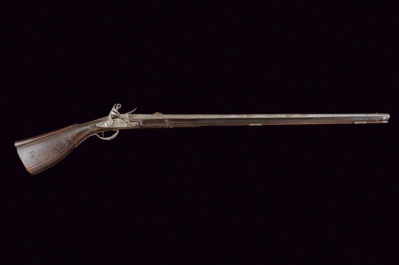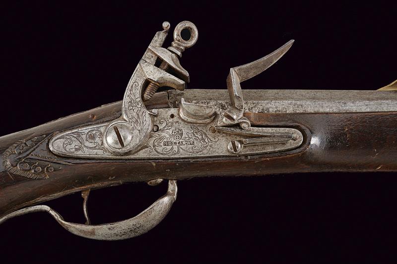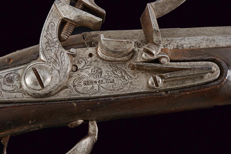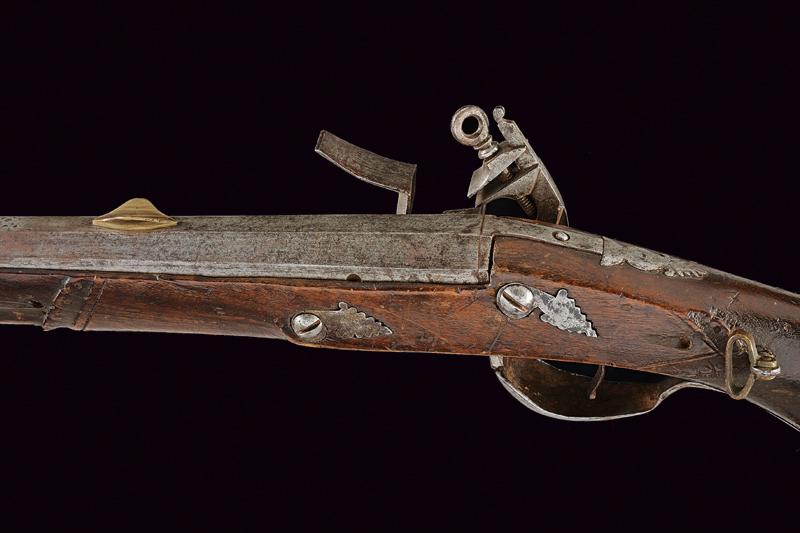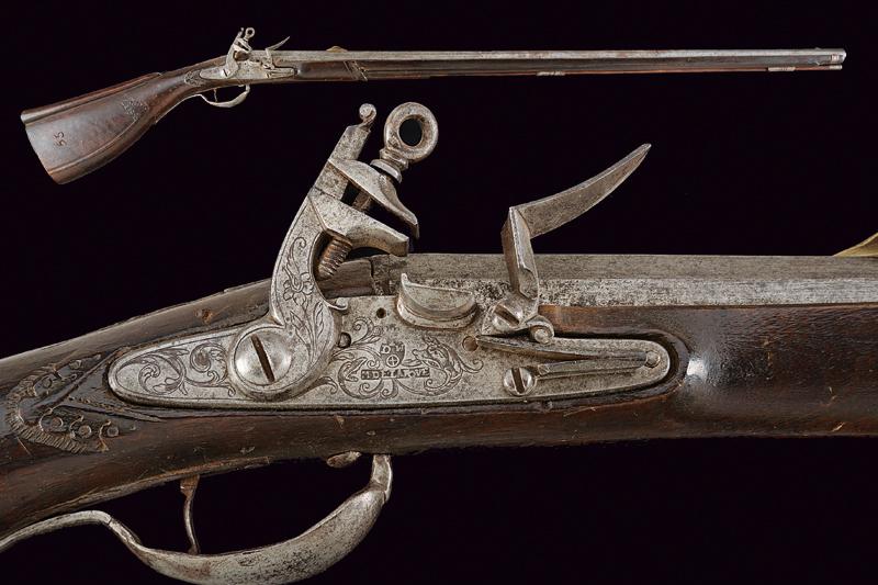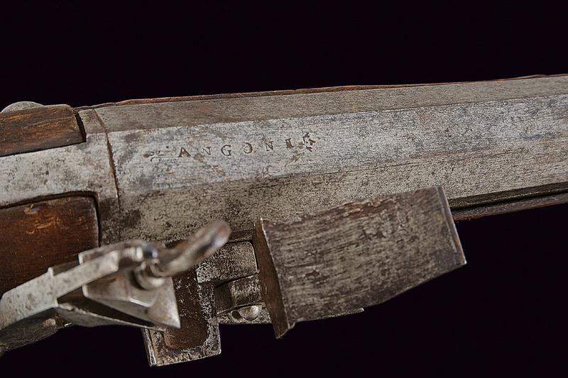 Raro fucile a pietra focaia, datazione: XVII Secolo provenienza: Italia, Canna liscia a tre ordini; la prima parte ottagonale marcata 'ANGONE' e munito di alzo a sella in ottone, la seconda a sedici facce, e la terza tonda con mirino, cal. 17 mm. Batteria a pietra focaia di forma arcaica, firmata 'MDELAROVE', con punzone 'D.W.' sormontante una ruota con croce all'interno ed incisa a motivi floreali e con teste di serpenti. Cassa intera in legno leggermente scolpito, marcata '55' sulla guancia. Fornimenti in ferro. Bacchetta in legno con battipalla e cavastracci in ferro. lunghezza 142.5 cm.