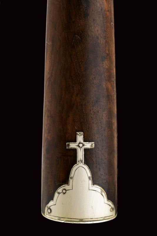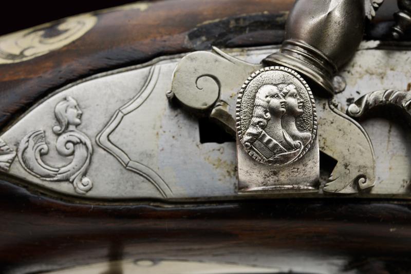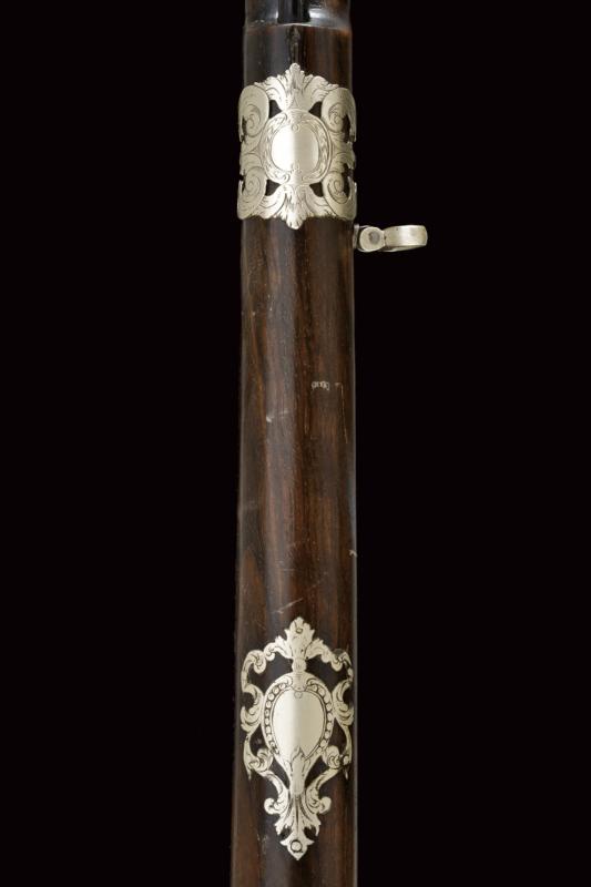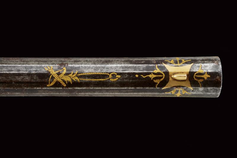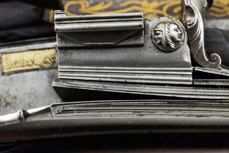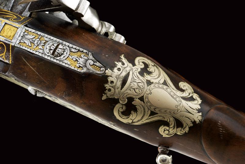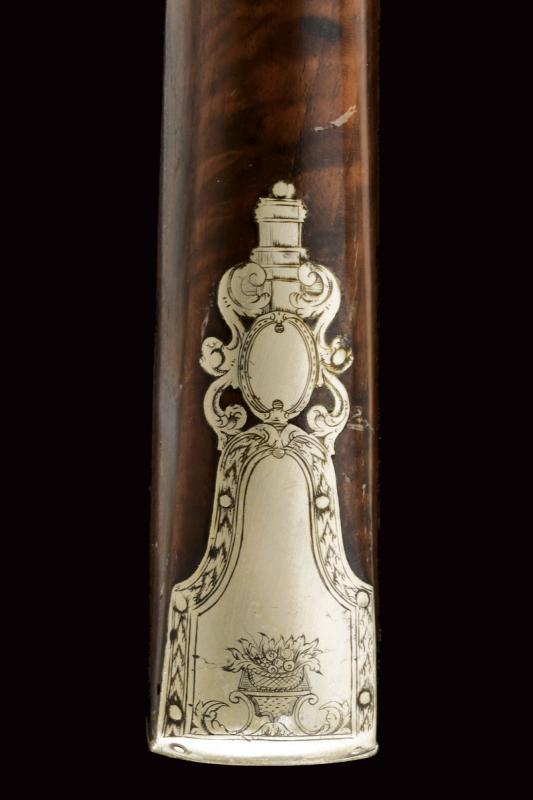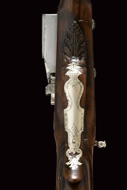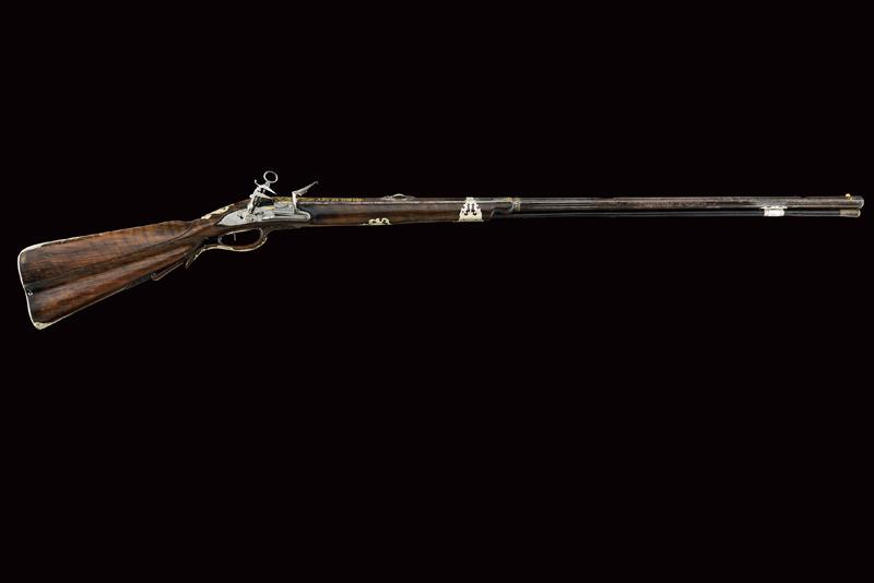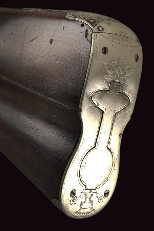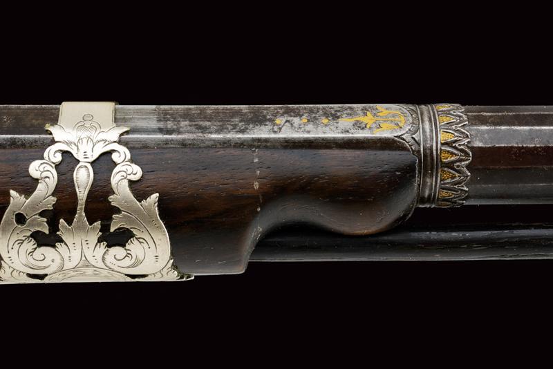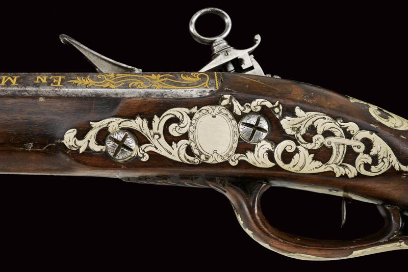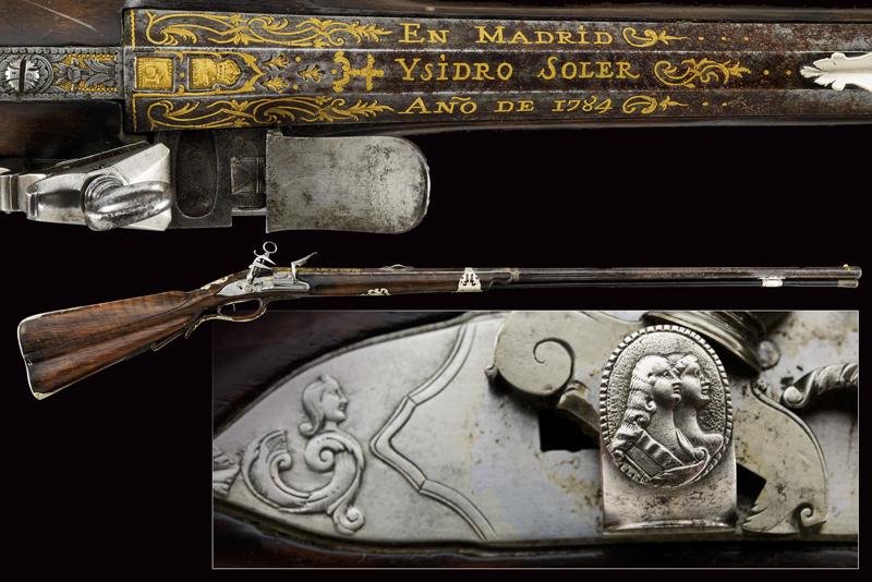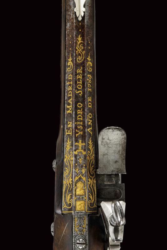 Bellissimo fucile alla romana a pietra focaia con canna di Isidro Soler, datazione: 1784 provenienza: Italia e Spagna, Canna liscia a due ordini, prima ottagonale, poi a sedifi facce, con anellature e decorazioni floreali al cambio, la base con marchi di Isidro Soler (Stöckel 1031 e 8263), iscrizione 'EN MADRID ISIDRO SOLER ANO DE 1784' fra decorazioni floreali, il tutto in oro. Alzo a sella in argento, decorazioni in oro al cambio e intorno al mirino a coda di rondine, resti di brunitura, zone con pitting, cal. 15.5 mm; codetta incisa e dorata. Elegantissima batteria alla romana decorata con busti intagliati con firma in argento 'Seb. Ces'; mezza cassa in legno con ponticello smpre in legno scolpito alle estremità a foglie. Fornimenti in argento con finissime incisioni parzialmente traforate, la coccia inferiore con croce, lo scudetto sul dorso sormontato da corona. Bacchetta in legno con battipalla in corno e cavastracci in ferro. Per Isidro Soler vedi 'Der Neue Stöckel', vol. II, pag. 1191. La firma della batteria è probabilmente di un armaiolo italiano come anche la cassa. lunghezza 132 cm.