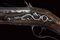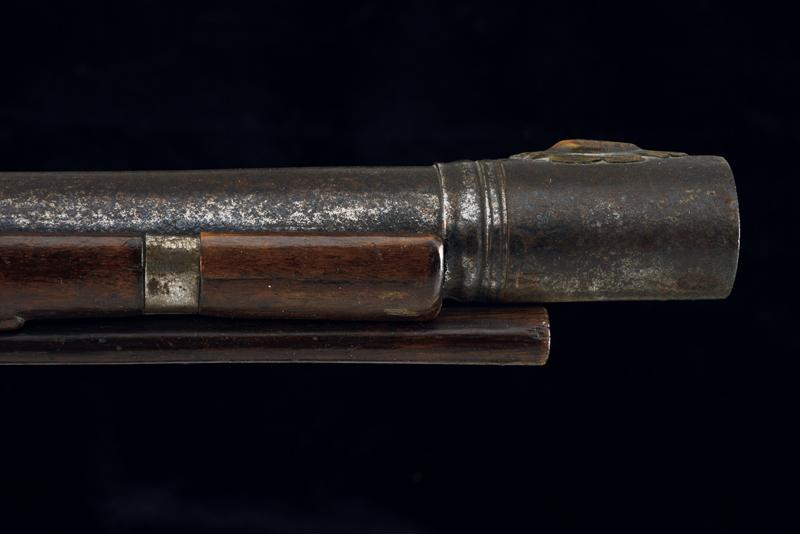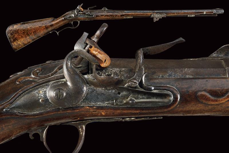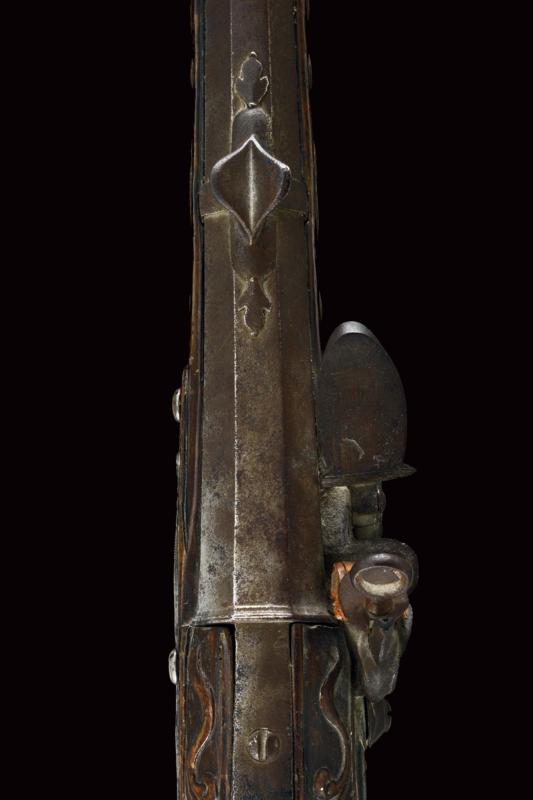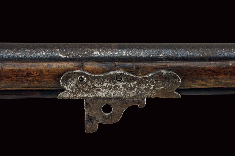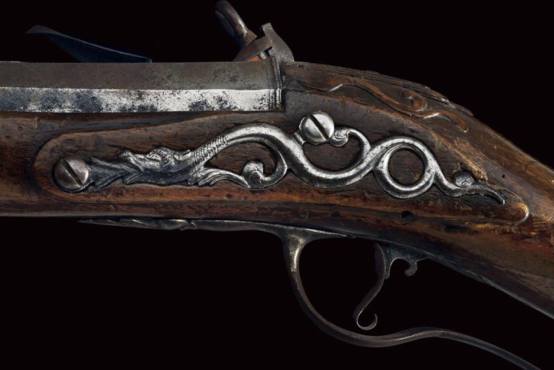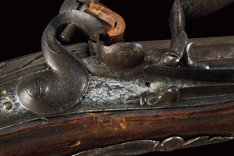 Pesante fucile da spalto a pietra focaia, datazione: ultimo quarto del XVII Sec. provenienza: Italia del Nord, Robusta canna liscia, a due ordini: il primo segmento ottagonale con modanatura alla culatta, grande alzo in ferro montato su fascetta, il secondo segmento di sezione tonda con anellature al cambio e volata munita di rinforzo cilindrico dotato di mirino in ottone. Cal. 17,2 mm. Batteria a cartella leggermente tondeggiante recante resti di incisioni con personaggi e animali mitologici; il collo del cane inciso con mascherone. Meccanica funzionante, due scatti. Cassa intera in legno dotata di grande e spessa pala; l'astina (con riparazione?) dotata di un fornimento in ferro con rampone per il tiro da posta fissato con tre viti. Gli altri fornimenti sempre in ferro. Semplice bacchetta in legno. lunghezza 122 cm.